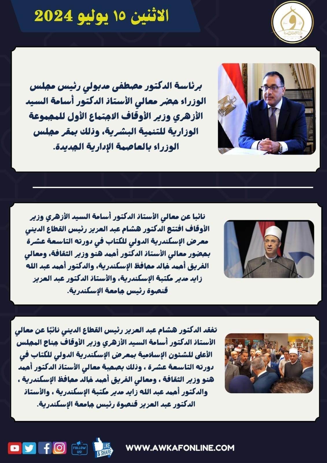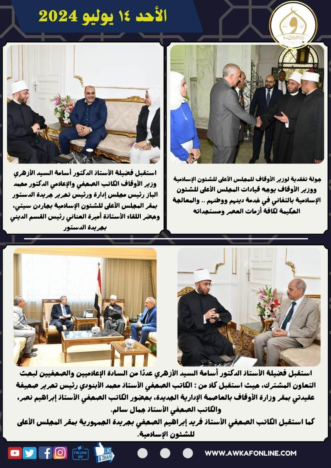 نشرة الحصاد الأسبوعي لرصد أنشطة وزارة الأوقاف في الفترة من 13 حتى 19 يوليو 2024