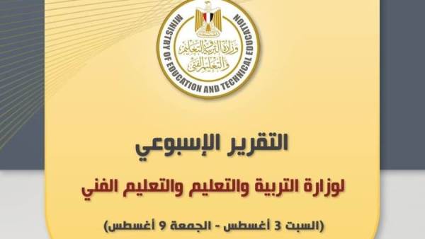 أصدر المركز الاعلامى لوزارة التربية والتعليم والتعليم الفنى التقرير الأسبوعى للوزارة خلال الفترة من السبت ٣ أغسطس - الجمعة ٩ أغسطس) ويتضمن ما يلى :