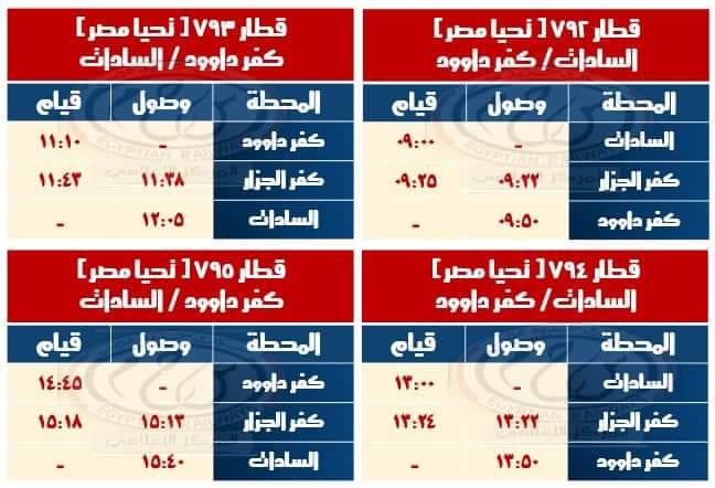 أعلنت الهيئة القومية لسكك حديد مصر، اليوم /الثلاثاء/، مواعيد القطارات على خط "القنطرة شرق / بئر العبد والعكس، وخط كفر داوود / السادات" والعكس بعربات "تحيا مصر".