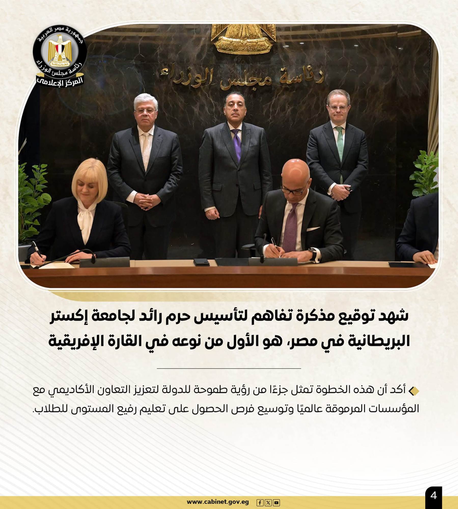 وخلال الأسبوع الجاري، شهد الدكتورمصطفى مدبولي توقيع مذكرة تفاهم لتأسيس حرم رائد لجامعة إكستر البريطانية في مصر، وهو الأول من نوعه في القارة الإفريقية، مؤكدًا أن هذه الخطوة تمثل جزءًا من رؤية طموحة للدولة لتعزيز التعاون الأكاديمي مع المؤسسات المرموقة عالميًا وتوسيع فرص الحصول على تعليم رفيع المستوى للطلاب.