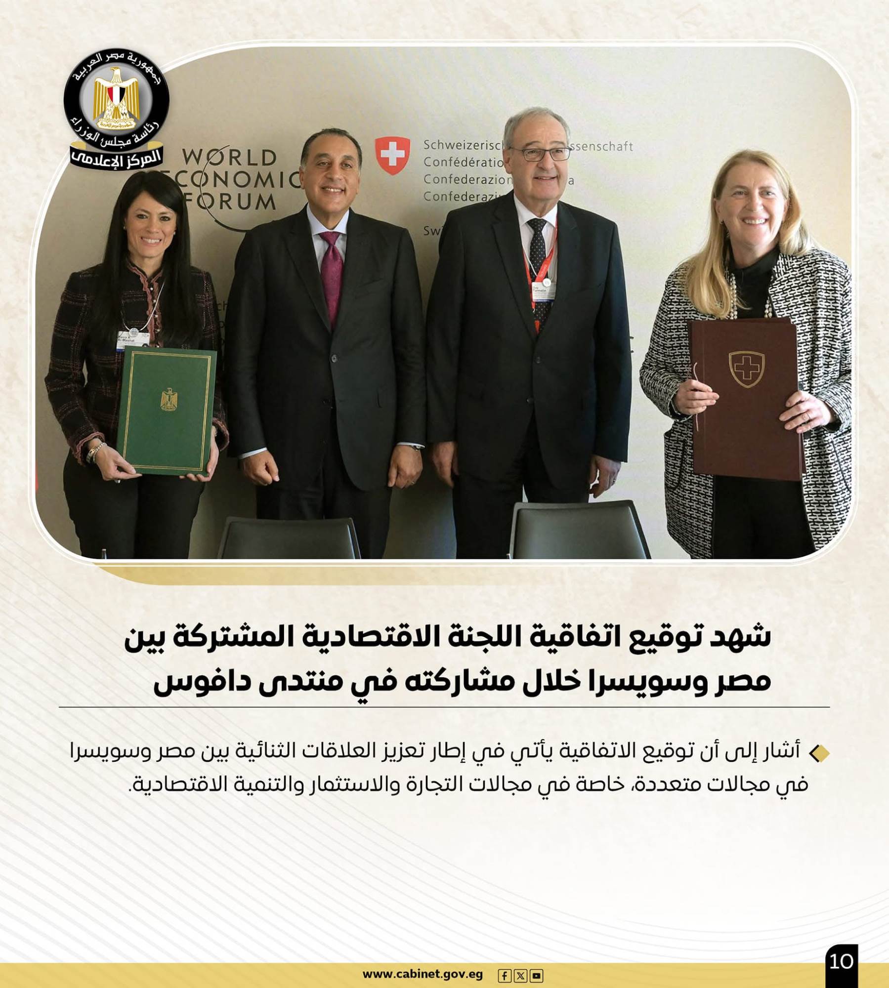 كما شهد الدكتور مصطفى مدبولي توقيع اتفاقية اللجنة الاقتصادية المشتركة بين مصر وسويسرا خلال مشاركته في منتدى دافوس، مشيرًا إلى أن توقيع الاتفاقية يأتي في إطار تعزيز العلاقات الثنائية بين مصر وسويسرا في مجالات متعددة، خاصة في مجالات التجارة والاستثمار والتنمية الاقتصادية.