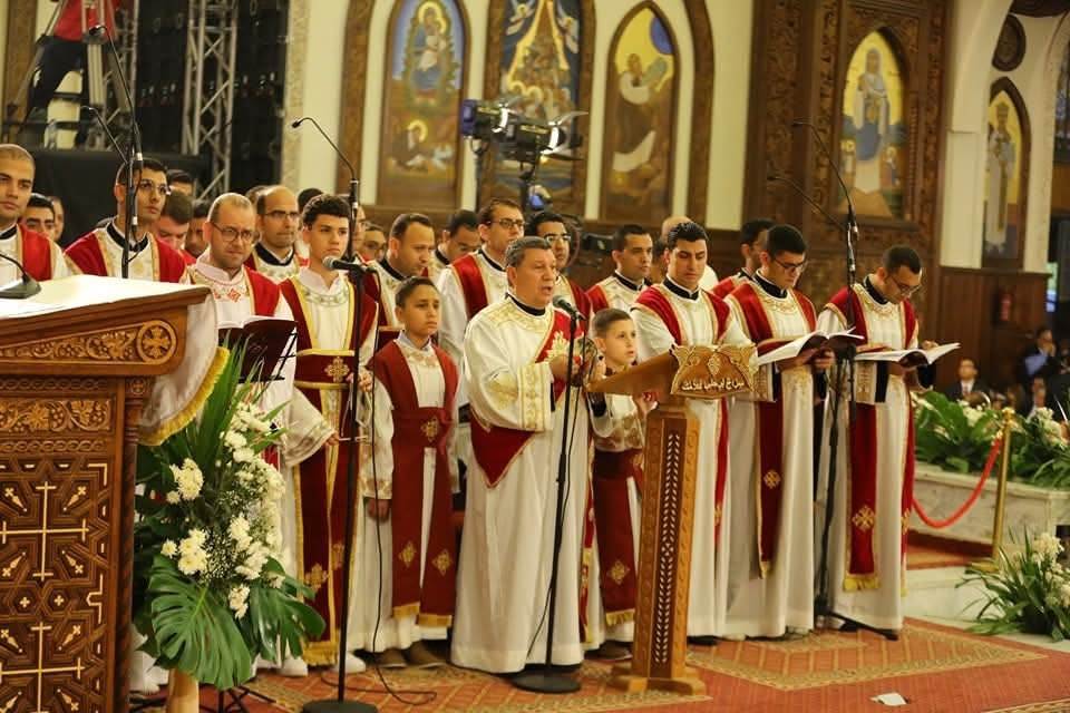 ودخل البابا تواضروس الثاني إلى الكنيسة الكبرى وسط موكب من كبار الأساقفة والكهنة والشمامسة بملابسهم الطقسية المميزة، وهم يحملون الصلبان ومرددين الألحان الخاصة بهذه المناسبة ، وتزينت الكنيسة بالأعلام البيضاء والورود ابتهاجا بالعيد.
