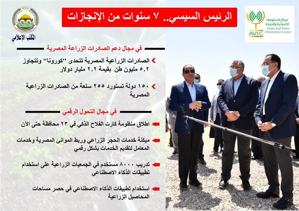 أصدر مركز المعلومات الصوتية والمرئية التابع لوزارة الزراعة واستصلاح الأراضي والمكتب الاعلامي للوزارة، عدد خاص من الانفوجراف والفيديو، بمناسبة مرور ٧ سنوات على تولي الرئيس عبدالفتاح السيسي الحكم، بعنوان: "الرئيس السيسي .. ٧ سنوات من الإنجازات نهضة زراعية شاملة (٢٠١٤- ٢٠٢١).