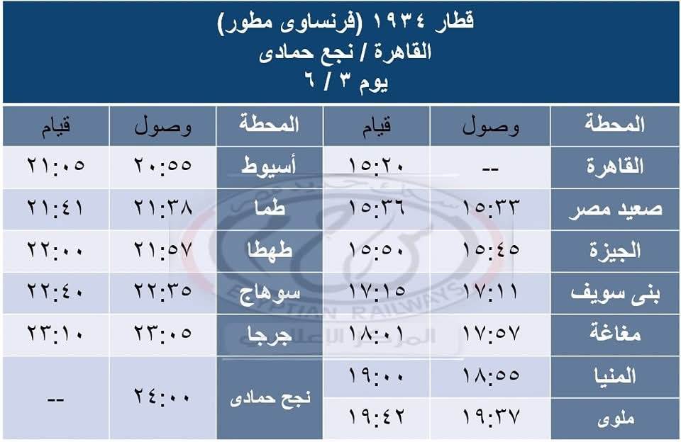 وذكرت الهيئة، في بيان لها، أنه سيتم تشغيل قطار مخصوص 1932 VIP (القاهرة/ أسوان)؛ حيث يقوم من القاهرة الساعة 22:50 يوم الاثنين المقبل ويصل أسوان الساعة 11:50 في اليوم التالي، كما سيتم تشغيل قطار مخصوص 1934 فرنساوي مطور (القاهرة/ نجع حمادي)، حيث يقوم من القاهرة الساعة 15:20 ويصل نجع حمادي الساعة 24:00، وذلك يوم الثلاثاء المقبل.