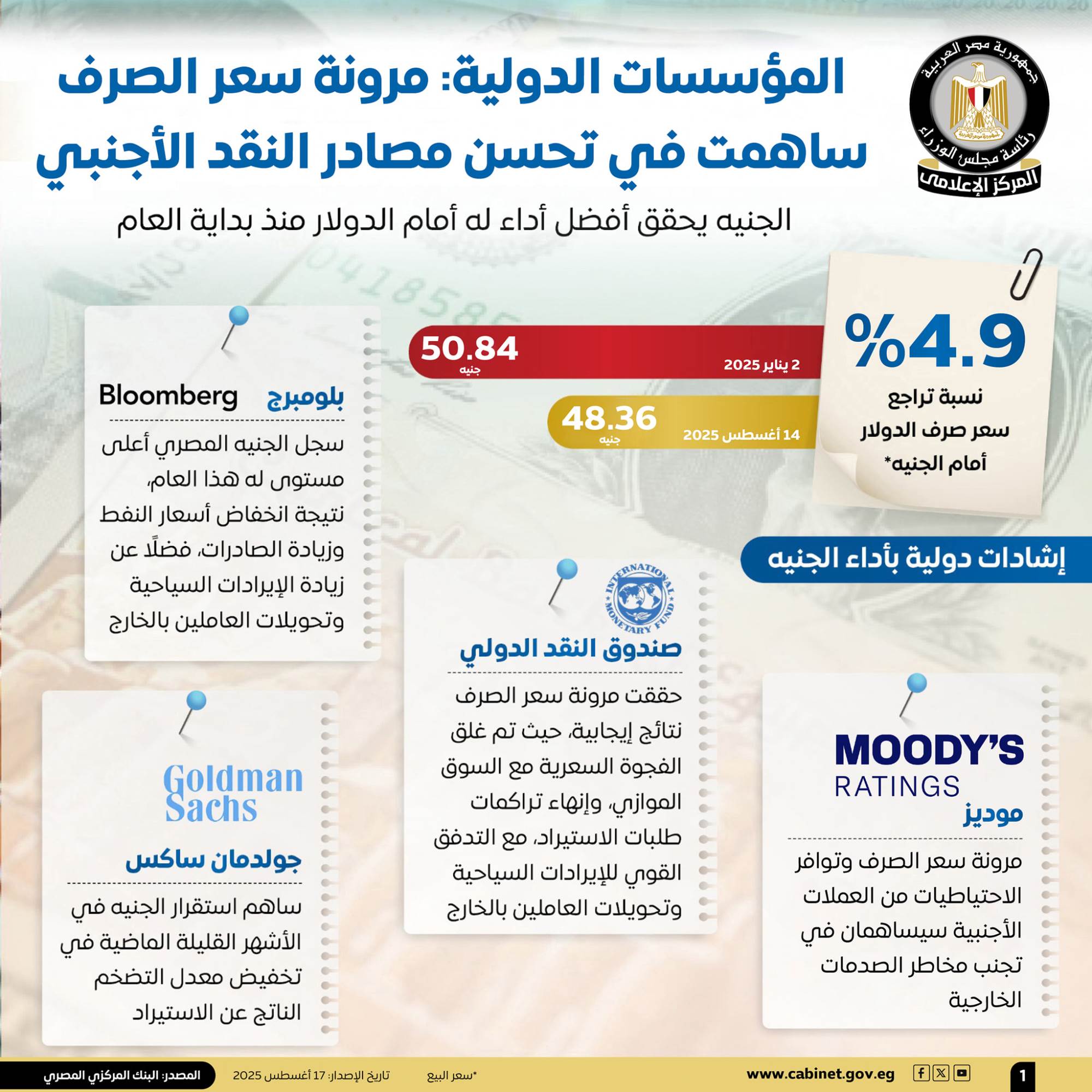 نشر المركز الإعلامي لمجلس الوزراء عددًا من الإنفوجرافات عبر منصاته على مواقع التواصل الاجتماعي، استعرض من خلالها تحقيق الجنيه أفضل أداء له أمام الدولار منذ بداية العام، وسط إشادات دولية بمرونة سعر الصرف والتي ساهمت في تحسن مصادر النقد الأجنبي.