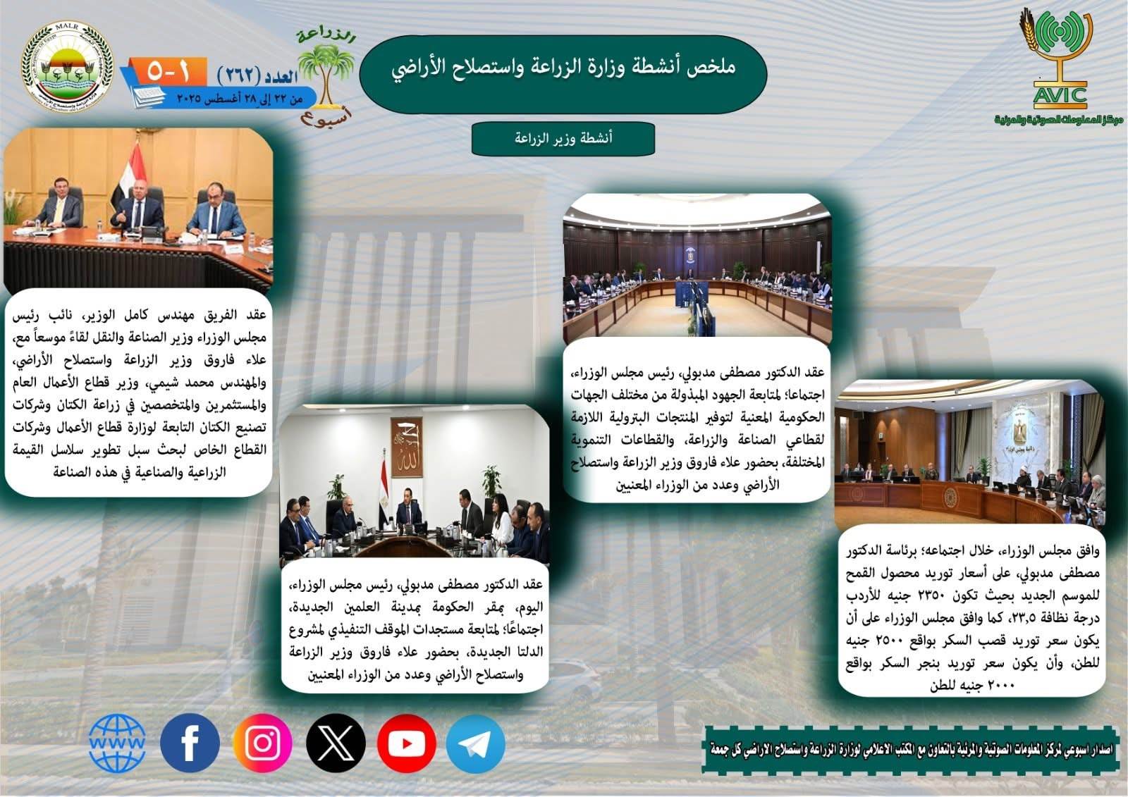 وعقد الدكتور مصطفى مدبولي، رئيس مجلس الوزراء، اجتماعا؛ لمتابعة الجهود المبذولة من مختلف الجهات الحكومية المعنية لتوفير المنتجات البترولية اللازمة لقطاعي الصناعة والزراعة، والقطاعات التنموية المختلفة، بحضور علاء فاروق وزير الزراعة واستصلاح الأراضي وعدد من الوزراء المعنيين، كما عقد أيضا اجتماعًا؛ لمتابعة مستجدات الموقف التنفيذي لمشروع الدلتا الجديدة، بحضور علاء فاروق وزير الزراعة واستصلاح الأراضي وعدد من الوزراء المعنيين.