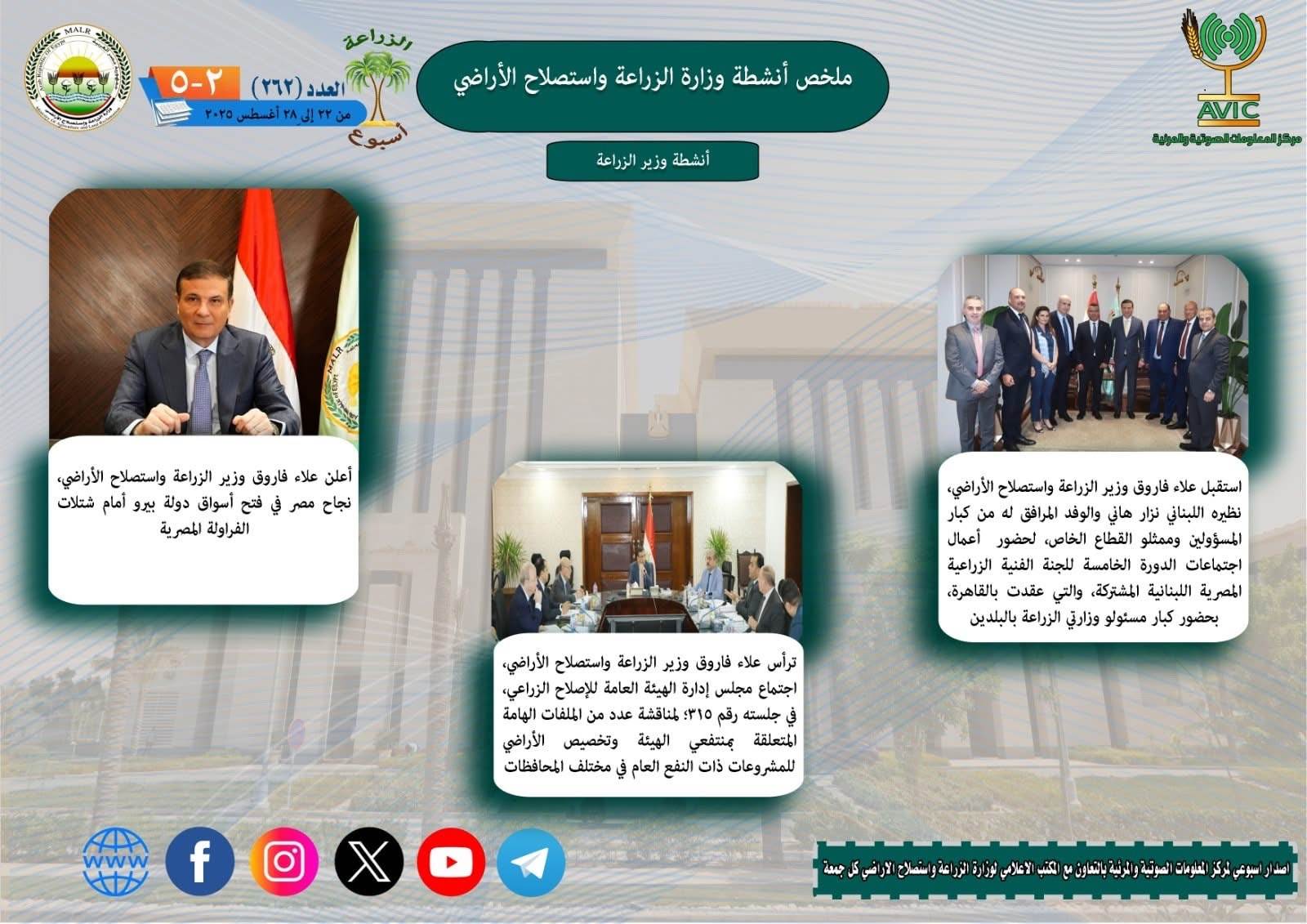 وخلال هذا الأسبوع استقبل علاء فاروق وزير الزراعة واستصلاح الأراضي، نظيره اللبناني نزار هاني والوفد المرافق له من كبار المسؤولين وممثلو القطاع الخاص، لحضور أعمال اجتماعات الدورة الخامسة للجنة الفنية الزراعية المصرية اللبنانية المشتركة، والتي عقدت بالقاهرة، بحضور كبار مسئولو وزارتي الزراعة بالبلدين، كما ترأس وزير الزراعة، اجتماع مجلس إدارة الهيئة العامة للإصلاح الزراعي، في جلسته رقم 315؛ لمناقشة عدد من الملفات الهامة المتعلقة بمنتفعي الهيئة وتخصيص الأراضي للمشروعات ذات النفع العام في مختلف المحافظات، كذلك أعلن "فاروق" نجاح مصر في فتح أسواق دولة بيرو أمام شتلات الفراولة المصرية.