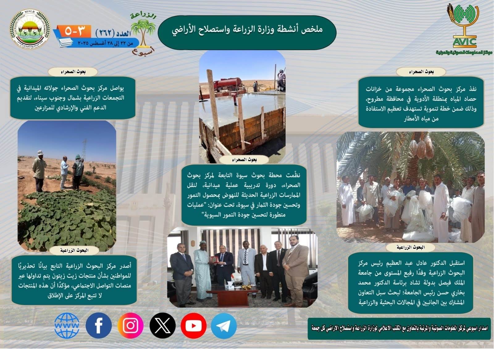 بينما نفذ مركز بحوث الصحراء مجموعة من خزانات حصاد المياه بمنطقة الأدوية في محافظة مطروح، وذلك ضمن خطة تنموية تستهدف تعظيم الاستفادة من مياه الأمطار، كما واصل المركز جولاته الميدانية في التجمعات الزراعية بشمال وجنوب سيناء، لتقديم الدعم الفني والإرشادي للمزارعين، كذلك نظّمت محطة بحوث سيوة التابعة لمركز بحوث الصحراء، دورة تدريبية عملية ميدانية، لنقل الممارسات الزراعية الحديثة للنهوض بمحصول التمور وتحسين جودة الثمار في سيوة، تحت عنوان: "عمليات متطورة لتحسين جودة التمور السيوية".