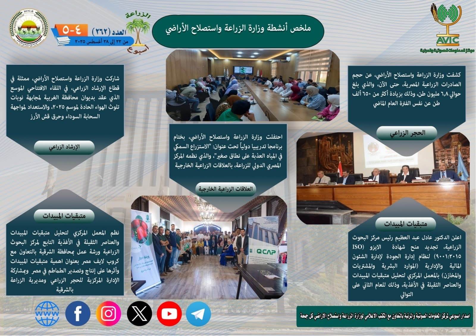 أصدر مركز المعلومات الصوتية والمرئية بوزارة الزراعة واستصلاح الأراضي، "الانفوجراف الاسبوعي" في نسخته رقم 262 حول الحصاد الاسبوعي لأهم أنشطة الوزارة، خلال الاسبوع الماضي في الفترة من 22 وحتى 28 اغسطس الجاري، كما أصدر المركز ايضا ملخصا بالفيديو، حول انشطة الوزارة خلال نفس الفترة.