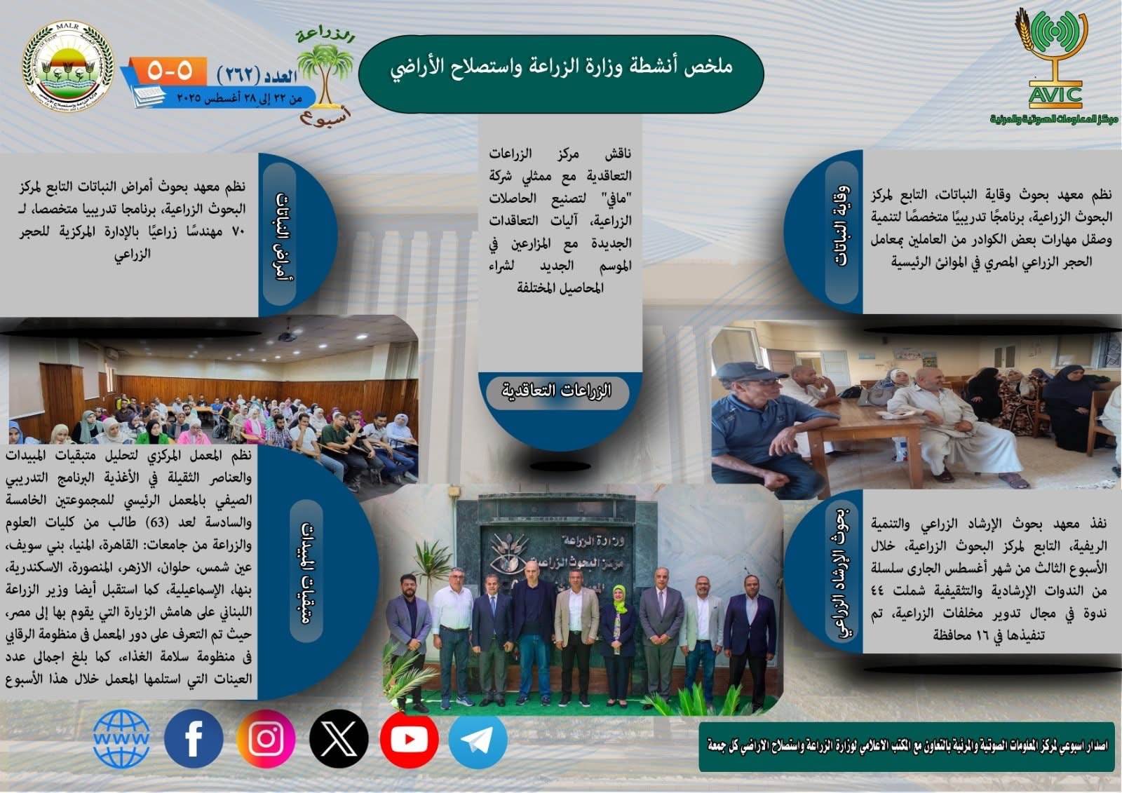 يذكر ان مركز المعلومات الصوتية والمرئية، والمكتب الاعلامي للوزارة، يصدران الجمعة من كل اسبوع، انفوجرافا وفيديو باسم: الزراعة في اسبوع، لالقاء الضوء على ملخص ما تم من انشطة وجهود، بكافة القطاعات والهيئات، التابعة للوزارة، فضلا عن انفوجراف وفيديو كل ثلاثاء باسم: الزراعة في كل مصر، حول انشطة وجهود القطاع الزراعي، بالمحافظات المختلفة.