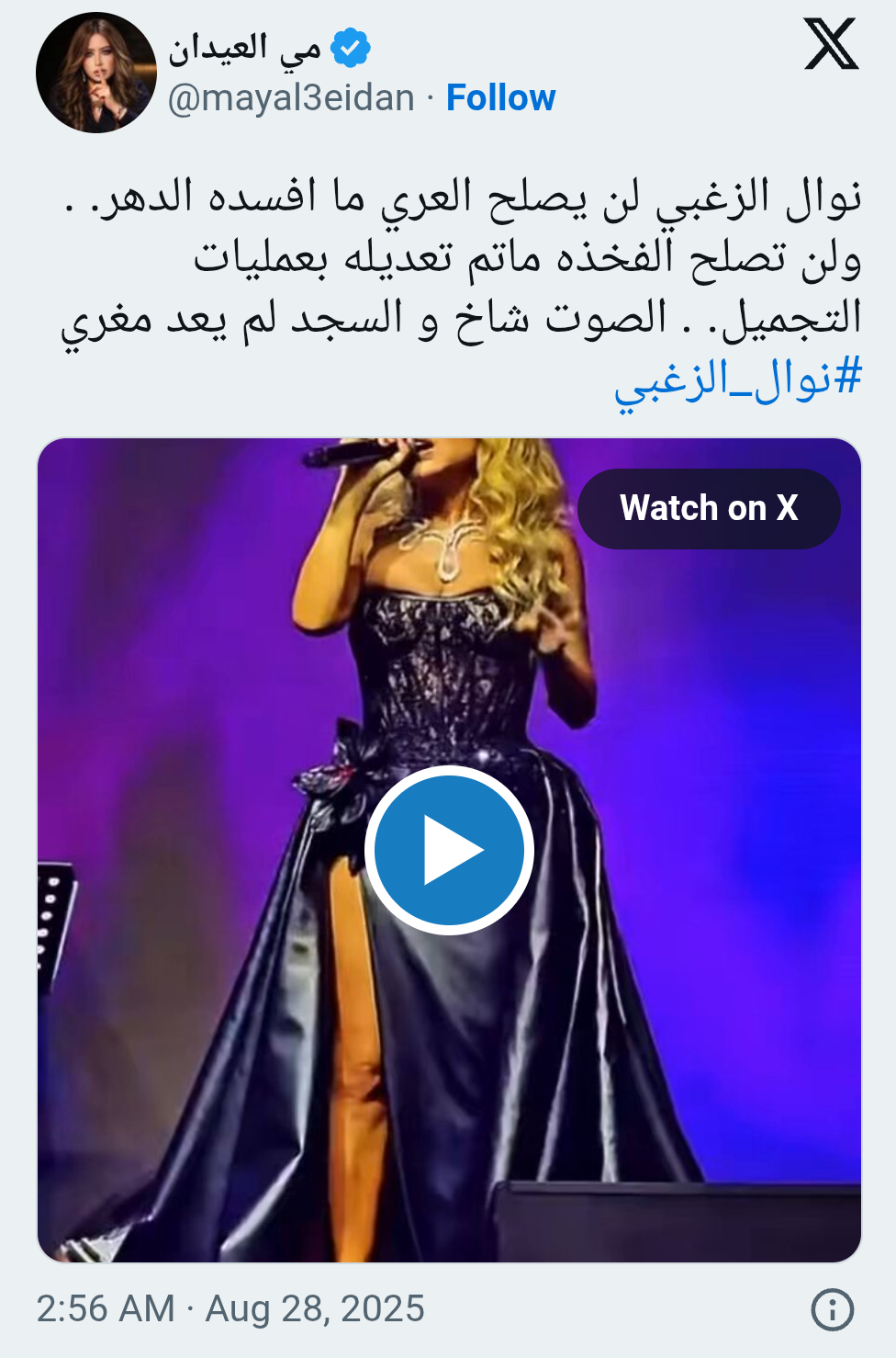 العيدان نشرت عبر حسابها مقطع فيديو من إحدى حفلات نوال الأخيرة، وأرفقته بتعليق قاسٍ قالت فيه: "نوال الزغبي لن يصلح العري ما أفسده الدهر.. ولن تصلح الفخذه ما تم تعديله بعمليات التجميل.. الصوت شاخ والجسد لم يعد مغري."