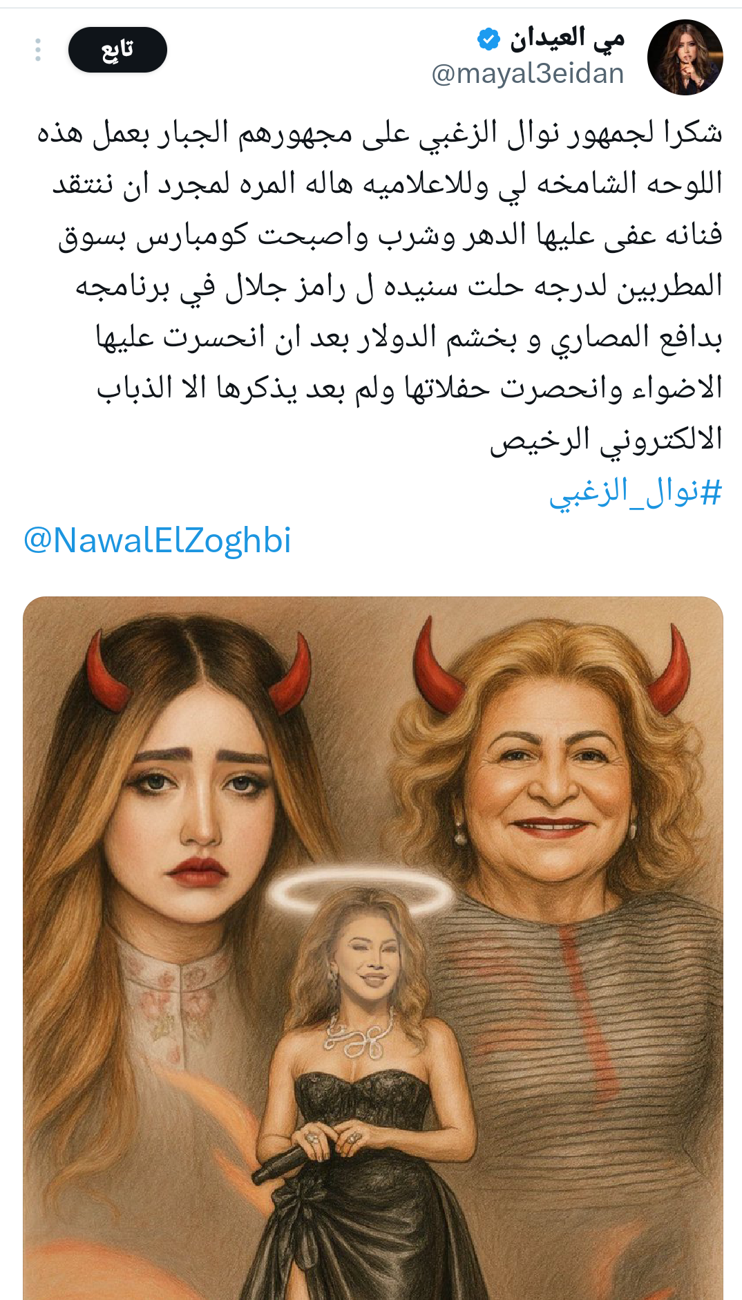 كلمات العيدان أثارت غضب جمهور نوال الزغبي، الذين سارعوا للرد بطريقتهم الخاصة عبر صورة تم تداولها على نطاق واسع، ظهرت فيها مي العيدان في هيئة "شيطان"، بينما رُسمت نوال الزغبي بمظهر "ملاك"، في إشارة رمزية للدفاع عن نجمتمهم ورفض ما اعتبروه إساءة غير مبررة.