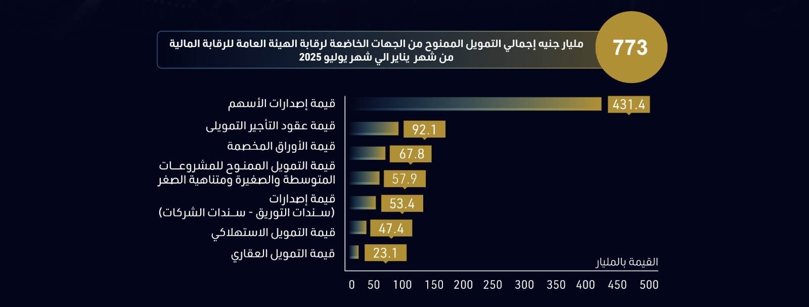 773 مليار جنيه إجمالي التمويل الممنوح من الجهات الخاضعة لرقابة الهيئة العامة للرقابة المالية بنهاية يوليو 2025