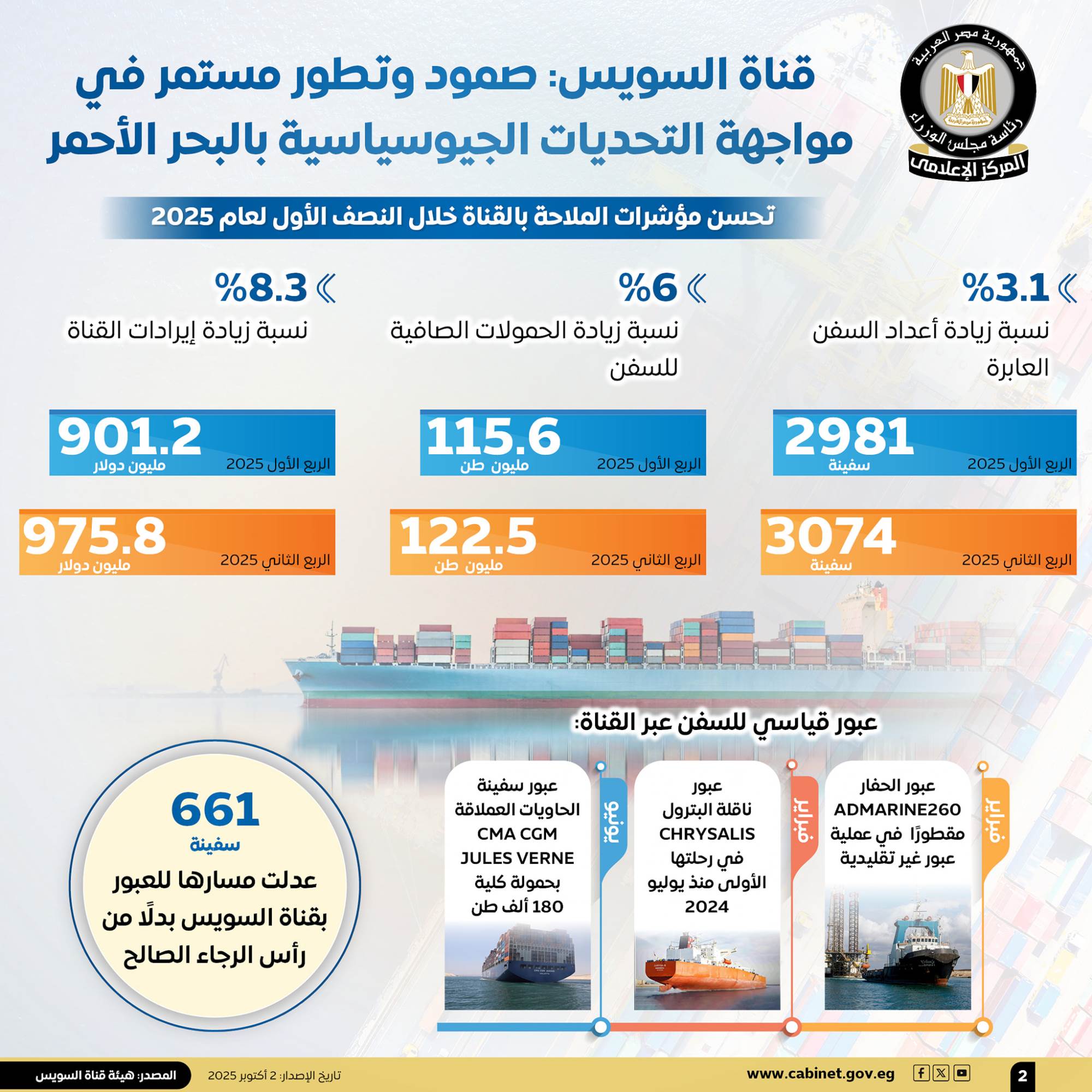 وأظهرت الإنفوجرافات، تحسن مؤشرات الملاحة بقناة السويس خلال النصف الأول لعام 2025، حيث زادت أعداد السفن العابرة بالقناة بنسبة 3.1%، لتصل إلى 3074 سفينة خلال الربع الثاني من عام 2025، مقارنة بـ 2981 سفينة خلال الربع الأول من العام ذاته.
