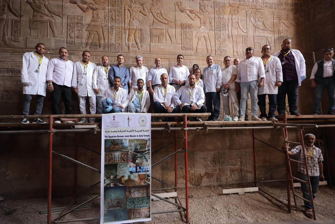 وأضاف أنه عند الانتهاء من ترميم الجدار الداخلي الجنوبي وكذلك الجزء الجنوبي من الجدار الخلفي الغربي، استطاع فريق العمل من استعادة الألوان الأصلية لهم مع الصبغات الصفراء والحمراء السائدة، الأمر الذي ساهم في الكشف عن التفاصيل المرسومة العديدة لملابس ملك وآلهة إسنا وتيجانهم وعروشهم، والتي لم تكن مرئية من قبل على الإطلاق بسبب طبقة السخام السميكة فوق النقوش البارزة، مشيراً أنه من المقرر أن تستكمل البعثة في شهر نوفمبر القادم أعمال تنظيف الجزء الخارجي من الأعمدة الستة الأمامية للمعبد.