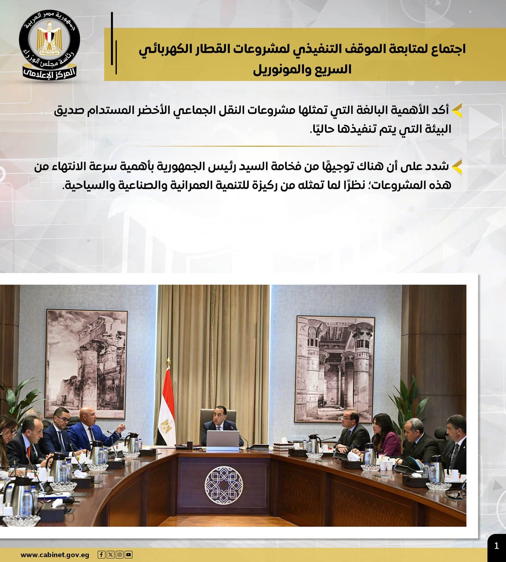 وتضمنت الأنشطة، اجتماع رئيس الوزراء لمتابعة الموقف التنفيذي لمشروعات القطار الكهربائي السريع والمونوريل، حيث أكد الأهمية البالغة لمشروعات النقل الجماعي الأخضر المستدام، مشددًا على أن هناك توجيهًا رئاسيًا بسرعة الانتهاء منها؛ باعتبارها ركيزة للتنمية العمرانية والصناعية والسياحية.
