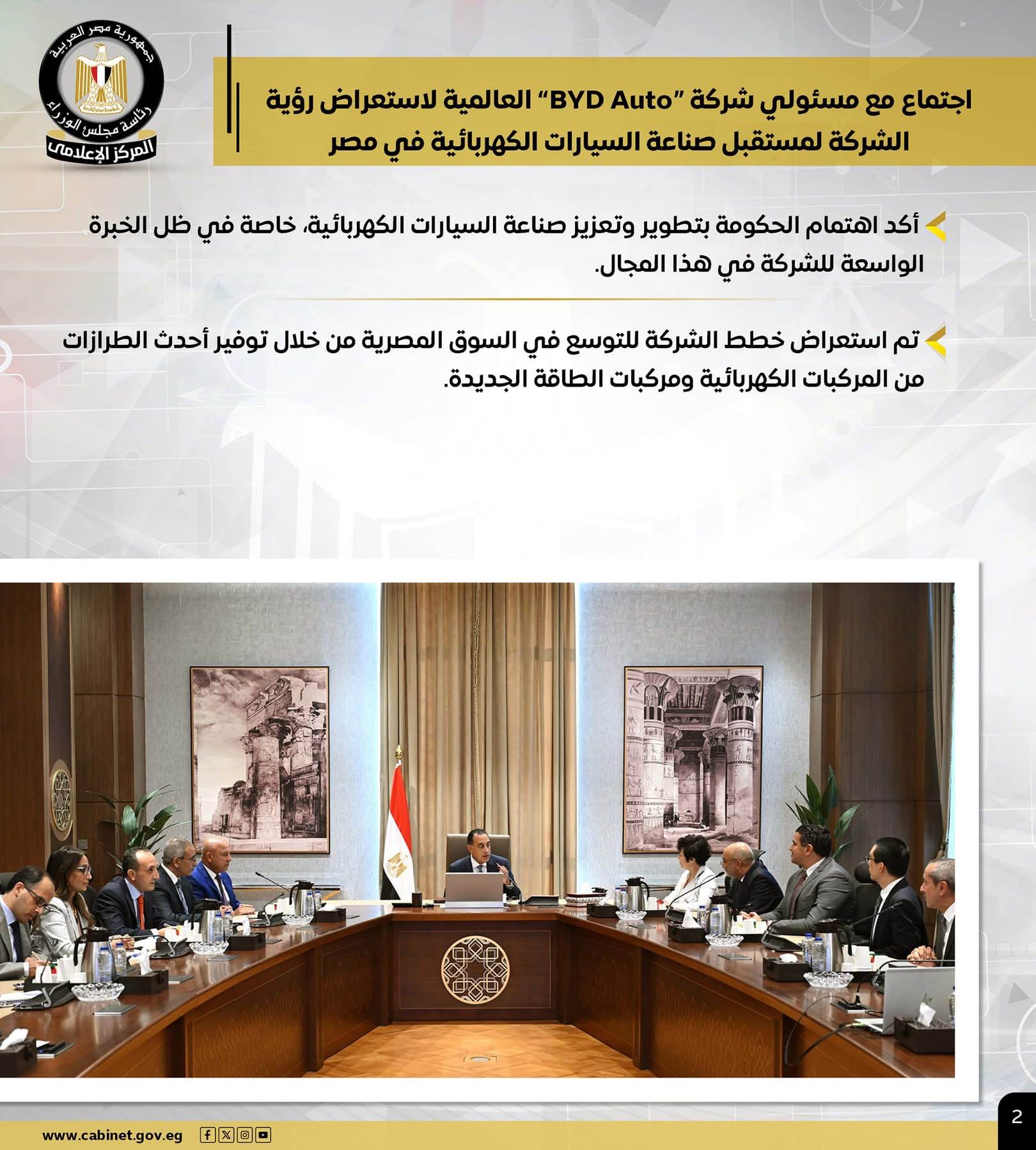 وشملت الأنشطة، اجتماعًا مع مسئولي شركة "BYD Auto" العالمية لاستعراض رؤية الشركة لمستقبل صناعة السيارات الكهربائية في مصر، حيث أكد سيادته اهتمام الحكومة بتطوير وتعزيز هذه الصناعة، كما تم استعراض خطط الشركة للتوسع في السوق المصرية من خلال توفير أحدث الطرازات من المركبات الكهربائية ومركبات الطاقة الجديدة.