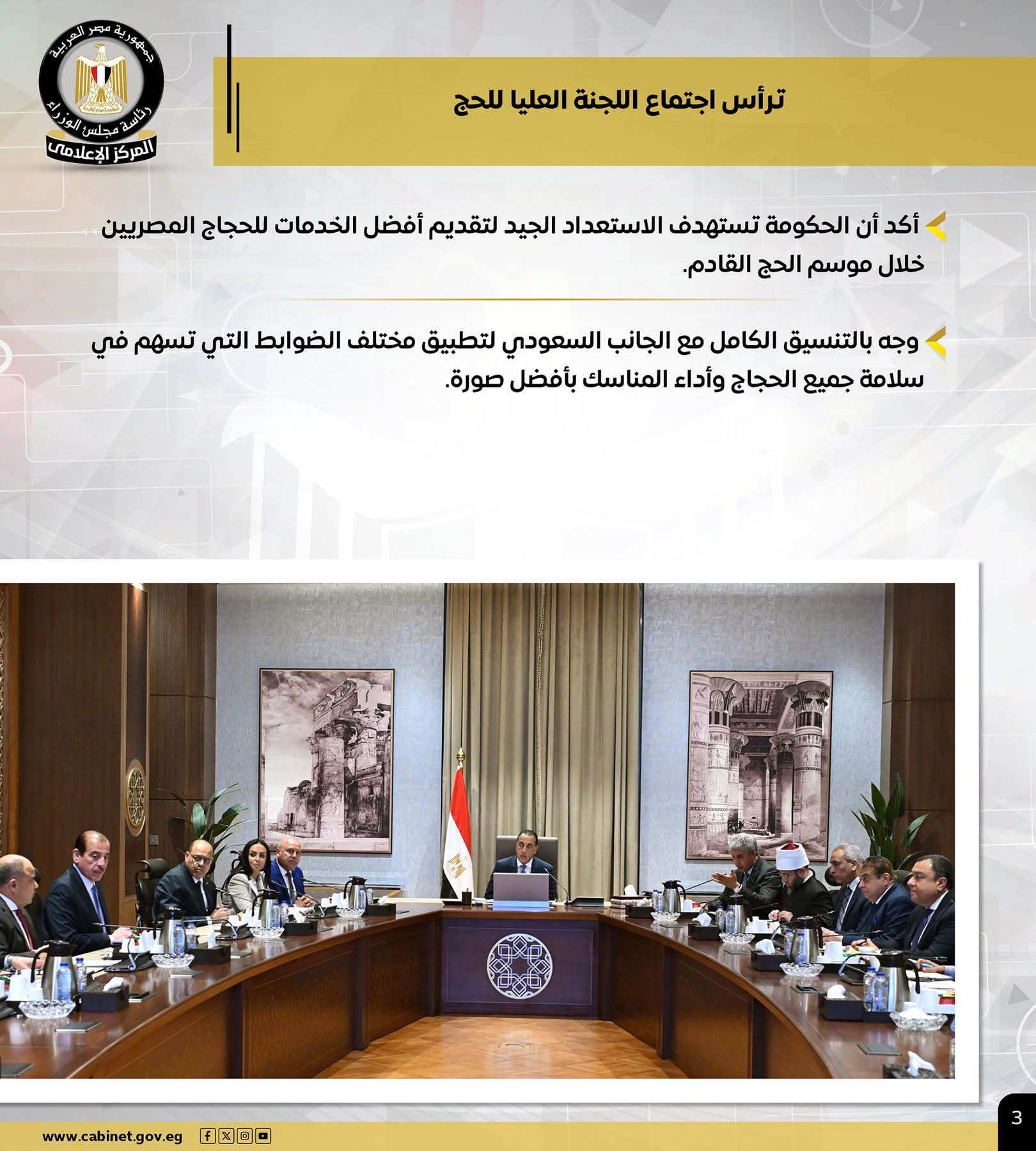 كما ترأس اجتماع اللجنة العليا للحج، وأكد خلاله أن الحكومة تستهدف الاستعداد الجيد لتقديم أفضل الخدمات للحجاج المصريين خلال موسم الحج القادم، موجهًا بالتنسيق الكامل مع الجانب السعودي لتطبيق الضوابط التي تسهم في أداء مناسك الحج بأفضل صورة.