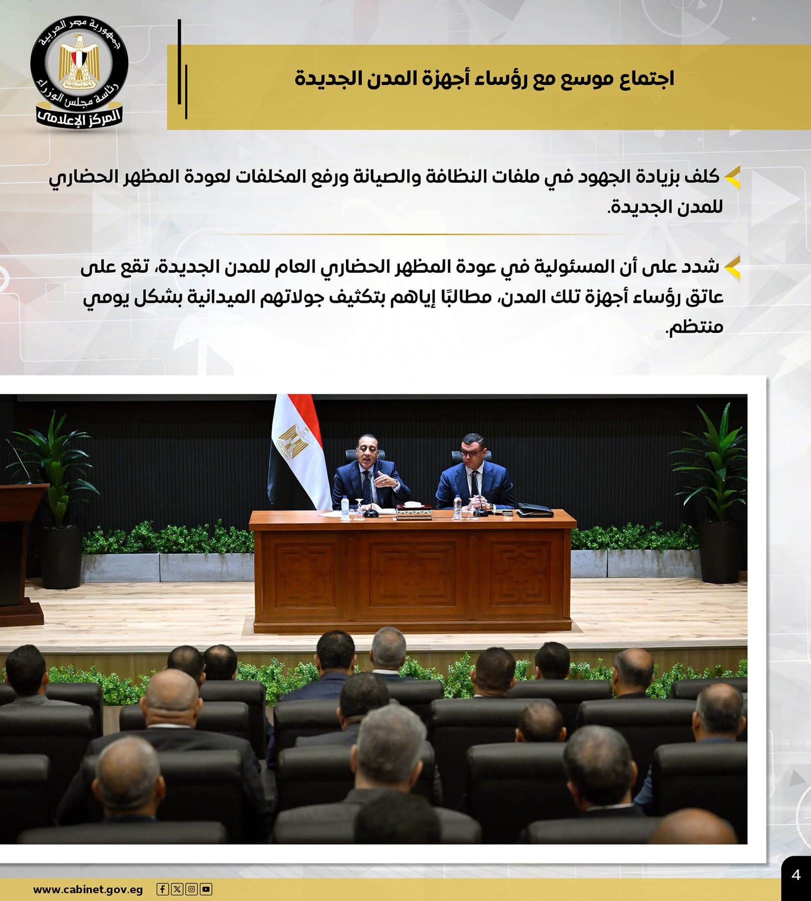 كما عقد اجتماعًا موسعًا مع رؤساء أجهزة المدن الجديدة، حيث كلف بزيادة الجهود في ملفات النظافة والصيانة لعودة المظهر الحضاري للمدن الجديدة، مشددًا على أن المسؤولية في ذلك تقع على عاتق رؤساء أجهزة تلك المدن، مطالبًا إياهم بتكثيف جولاتهم الميدانية بشكل يومي منتظم.