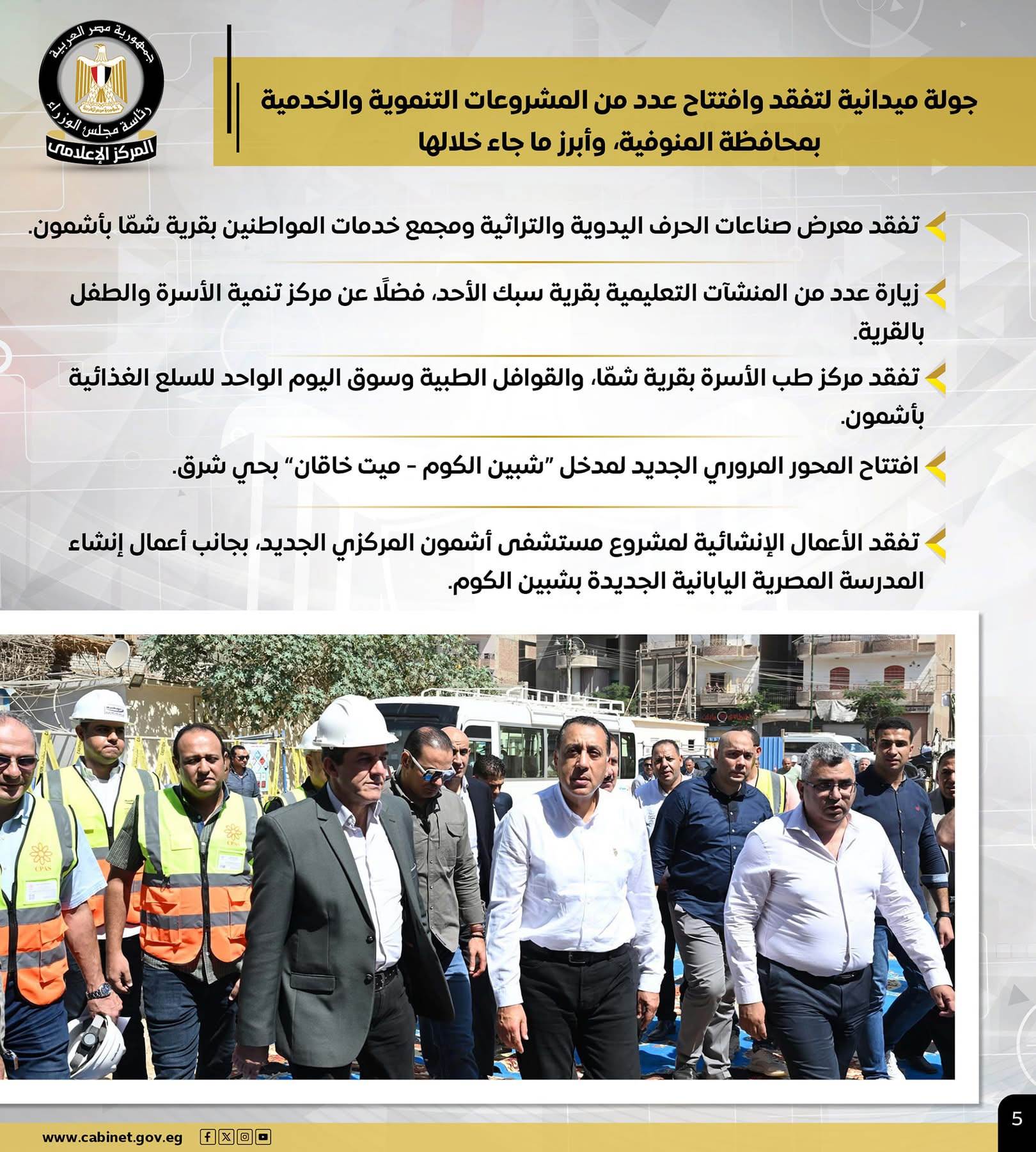 كما قام رئيس الوزراء بجولة ميدانية لتفقد وافتتاح عدد من المشروعات بمحافظة المنوفية، أبرزها تفقد معرض صناعات الحرف اليدوية والتراثية ومجمع خدمات المواطنين بقرية شمّا بأشمون، بالإضافة إلى زيارة عدد من المنشآت التعليمية بقرية سبك الأحد، فضلًا عن مركز تنمية الأسرة والطفل بالقرية.