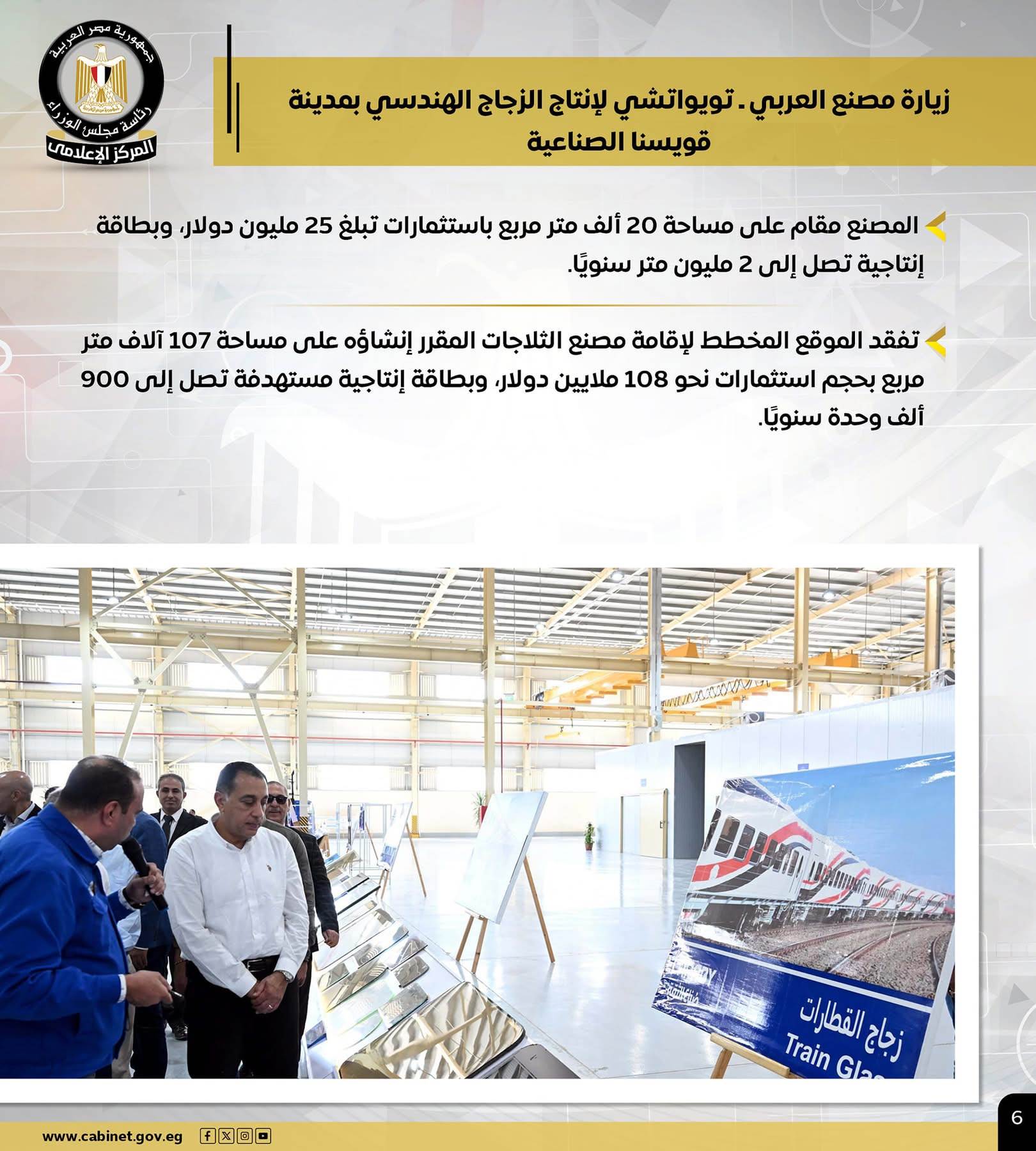 وخلال الجولة زار مصنع العربي ـ تويواتشي لإنتاج الزجاج الهندسي بمدينة قويسنا الصناعية، المقام على مساحة 20 ألف م2 باستثمارات تبلغ 25 مليون دولار، وبطاقة إنتاجية تصل إلى 2 مليون متر سنويًا.