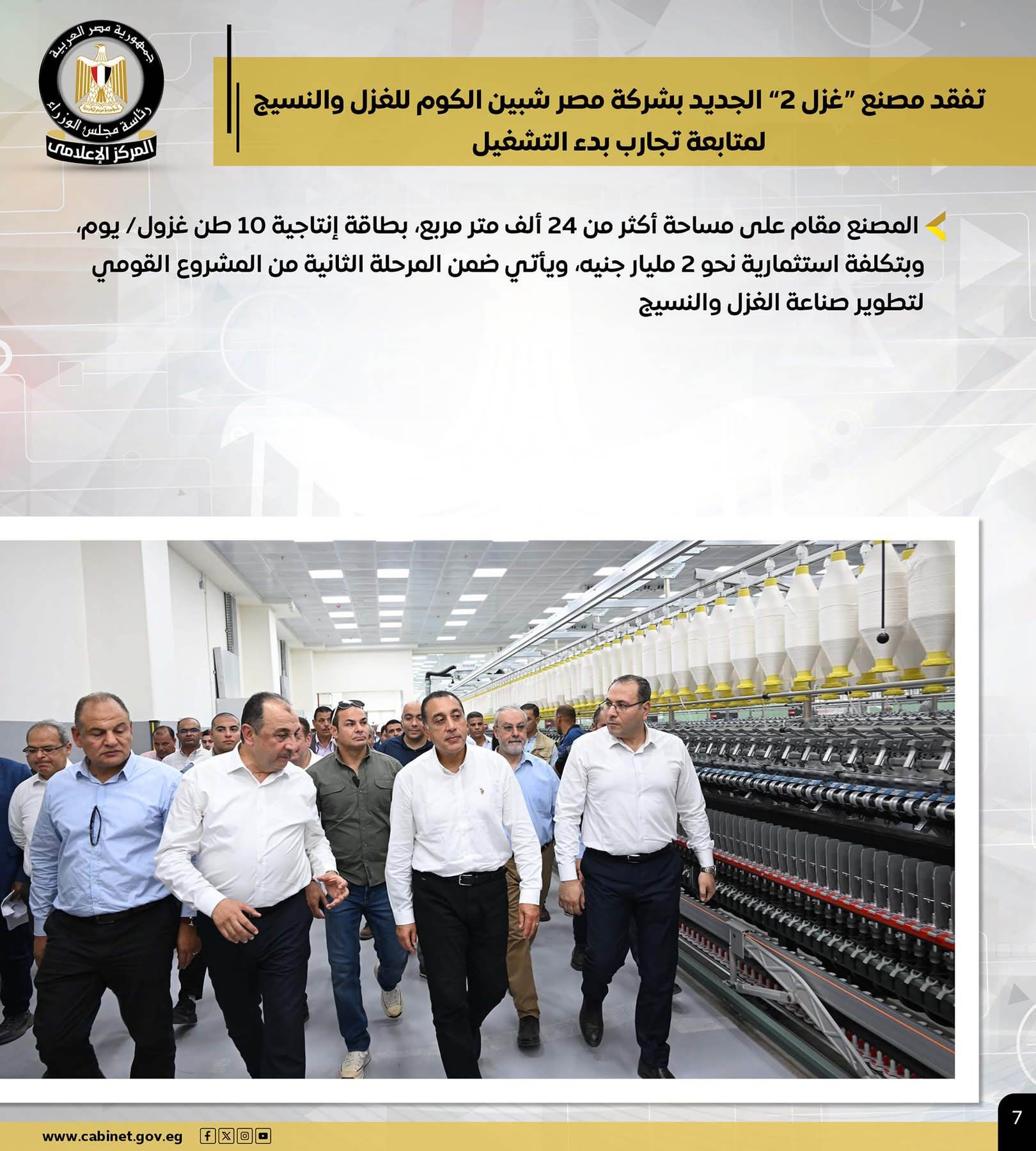 وتفقد مصنع "غزل 2" الجديد بشركة مصر شبين الكوم للغزل والنسيج، لمتابعة تجارب بدء التشغيل بالمصنع، المقام على مساحة أكثر من 24 ألف م2، بطاقة إنتاجية 10 أطنان من الغزول يوميًا، وبتكلفة نحو 2 مليار جنيه، والذي يأتي ضمن المرحلة الثانية من المشروع القومي لتطوير صناعة الغزل والنسيج.