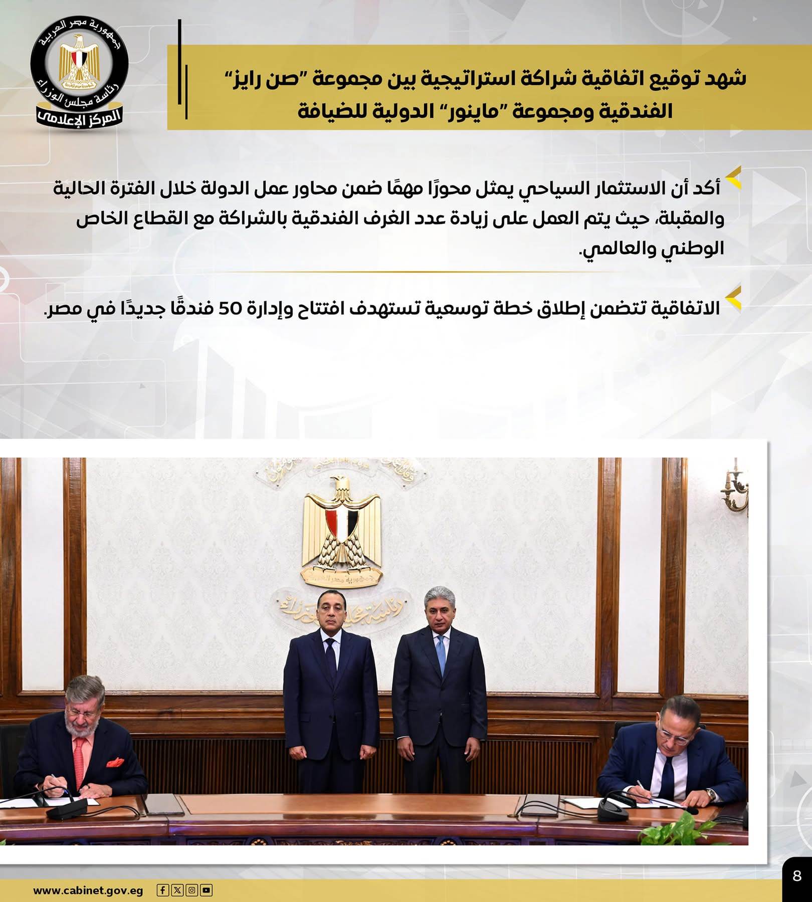 كما شهد رئيس الوزراء توقيع اتفاقية شراكة استراتيجية بين مجموعة "صن رايز" الفندقية ومجموعة "ماينور" الدولية للضيافة، مؤكدًا سيادته أن الاستثمار السياحي يمثل محورًا مهمًا ضمن محاور عمل الدولة خلال الفترة الحالية والمقبلة، وتتضمن الاتفاقية إطلاق خطة توسعية تستهدف افتتاح وإدارة 50 فندقًا جديدًا في مصر.