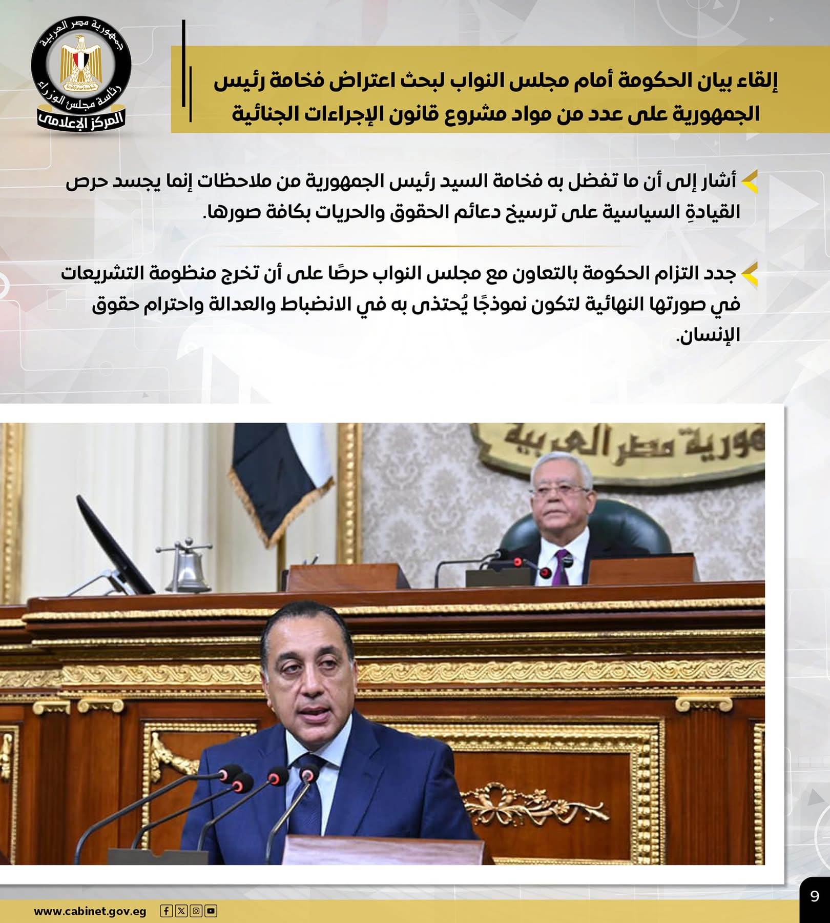 كما ألقى رئيس الوزراء بيان الحكومة أمام مجلس النواب، لبحث اعتراض رئيس الجمهورية على عدد من مواد مشروع قانون الإجراءات الجنائية، حيث أشار إلى أن ما تفضل به الرئيس من ملاحظات يجسد حرص القيادةِ السياسية على ترسيخ دعائم الحقوق والحريات بكافة صورها.