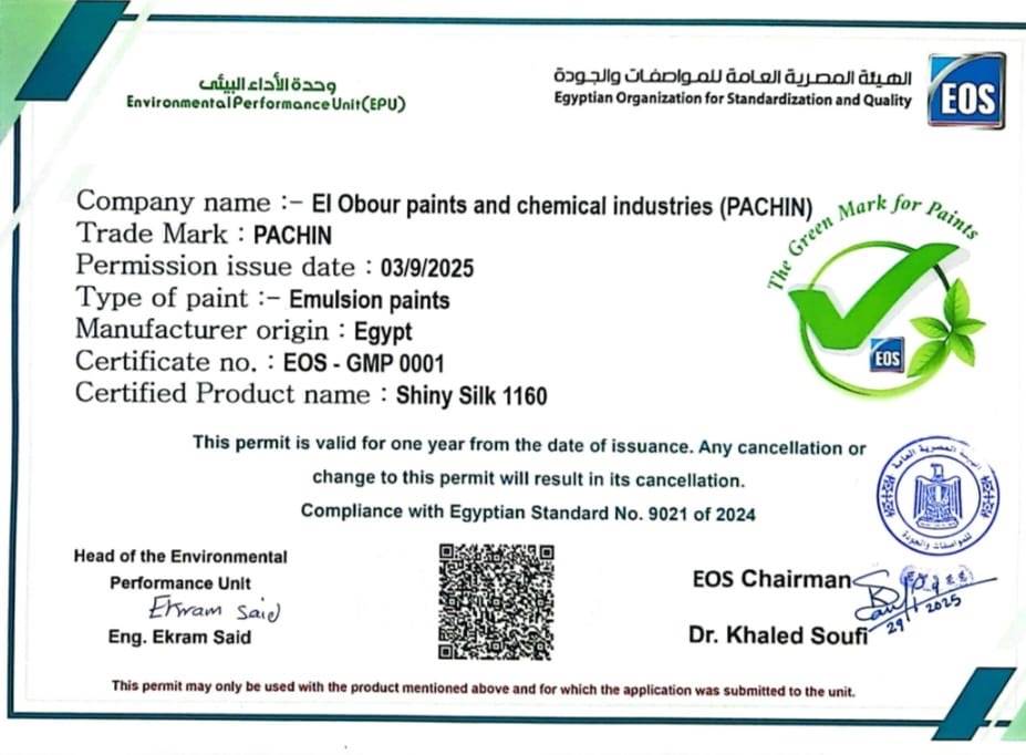 قامت الهيئة المصرية العامة للمواصفات والجودة بتسليم أول علامة خضراء للدهانات لشركة العبور للبويات والصناعات الكيماوية "باكين" عن منتجها شايني سيلك 1160، لتصبح بذلك أول شركة مصرية تنجح في الحصول على هذه العلامة الخضراء والتي تعد أداة هامة لتشجيع الصناعات الوطنية على التحول نحو الإنتاج المستدام، وتقديم منتجات آمنة وصديقة للبيئة تتوافق مع التوجهات العالمية في مواجهة التغيرات المناخية.