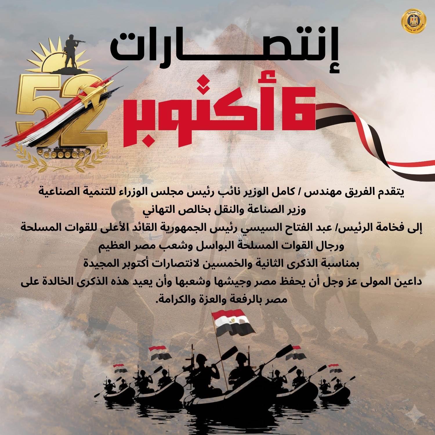 تقدم الفريق مهندس/ كامل الوزير نائب رئيس مجلس الوزراء للتنمية الصناعية وزير الصناعة والنقل بخالص التهنئة للرئيس عبد الفتاح السيسي رئيس الجمهورية القائد الأعلى للقوات المسلحة ورجال القوات المسلحة البواسل وشعب مصر العظيم بمناسبة الذكرى الثانية والخمسين لانتصارات أكتوبر المجيدة، داعياً المولى عز وجل أن يحفظ مصر وجيشها وشعبها وأن يعيد هذه الذكرى الخالدة على مصر بالرفعة والعزة والكرامة.