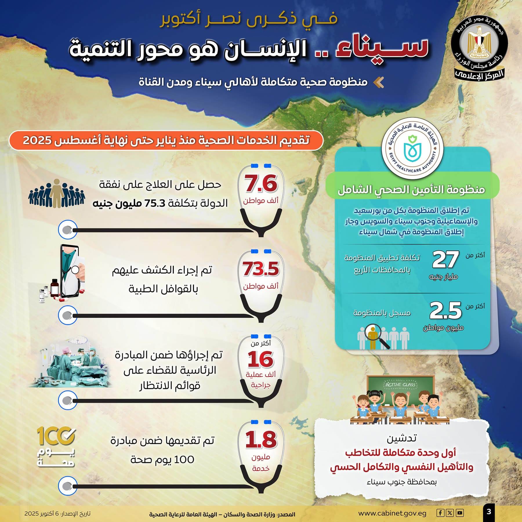 نشر المركز الإعلامي لمجلس الوزراء، عددًا من الإنفوجرافات على منصاته بمواقع التواصل الاجتماعي، تحت عنوان "سيناء.. الإنسان هو محور التنمية"، لتسليط الضوء على الطفرة التنموية والإنجازات في مختلف القطاعات في سيناء، بما ينعكس على تحسين حياة أبنائها، وذلك في ذكرى نصر أكتوبر.
