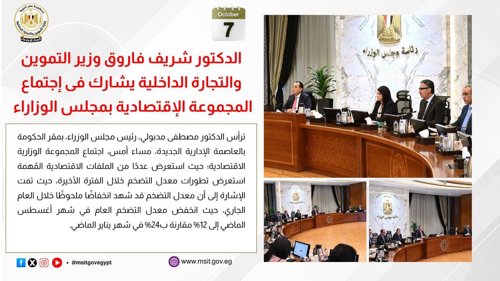 شارك الدكتور شريف فاروق في اجتماع اللجنة الاقتصادية برئاسة الدكتور مصطفى مدبولي رئيس مجلس الوزراء، بمقر الحكومة بالعاصمة الإدارية، حيث تم استعراض عدد من الملفات الاقتصادية المهمة ذات الصلة بالأمن الغذائي والتجارة الداخلية.