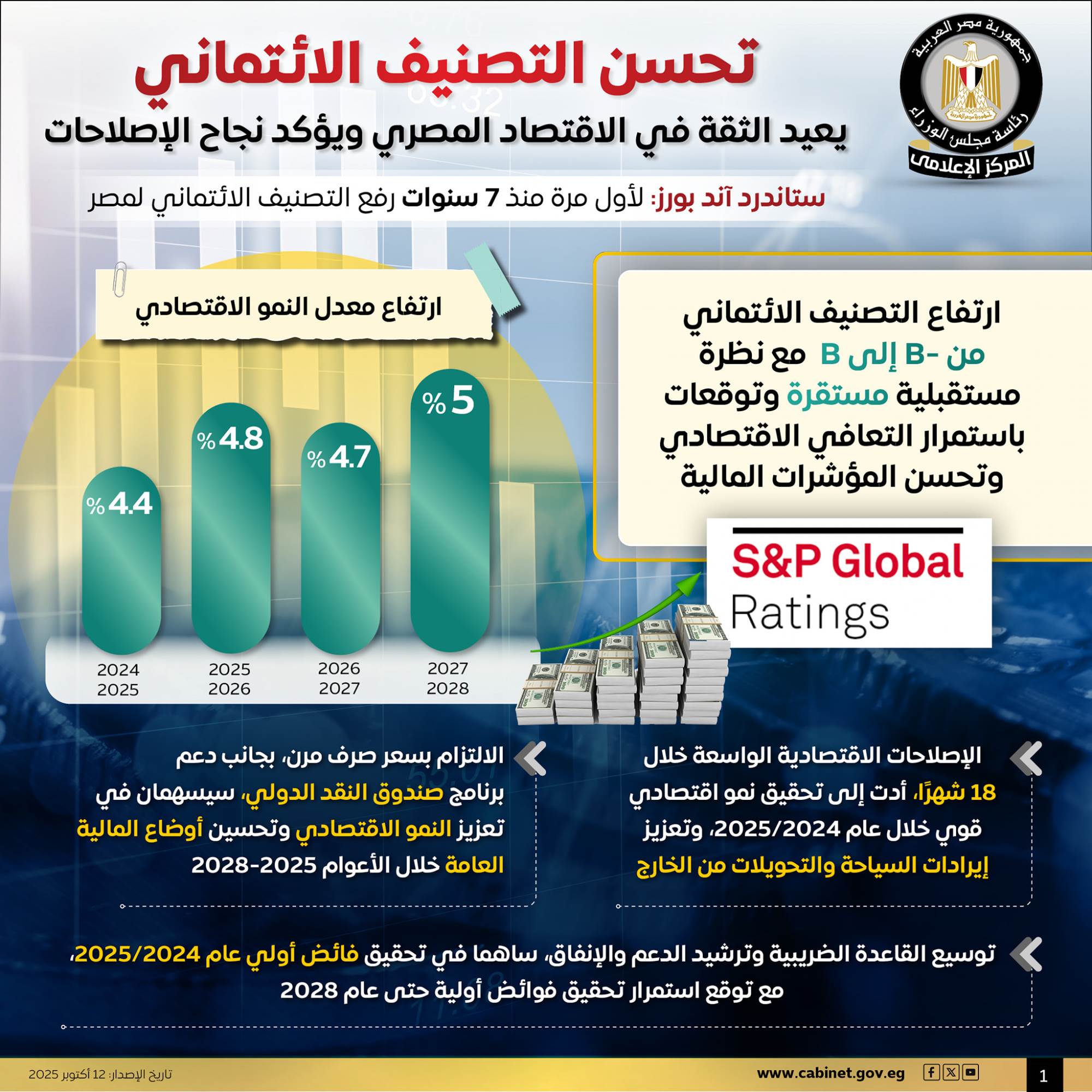 المركز الإعلامي لمجلس الوزراء: تحسن التصنيف الائتماني يعيد الثقة في الاقتصاد المصري ويؤكد نجاح الإصلاحات