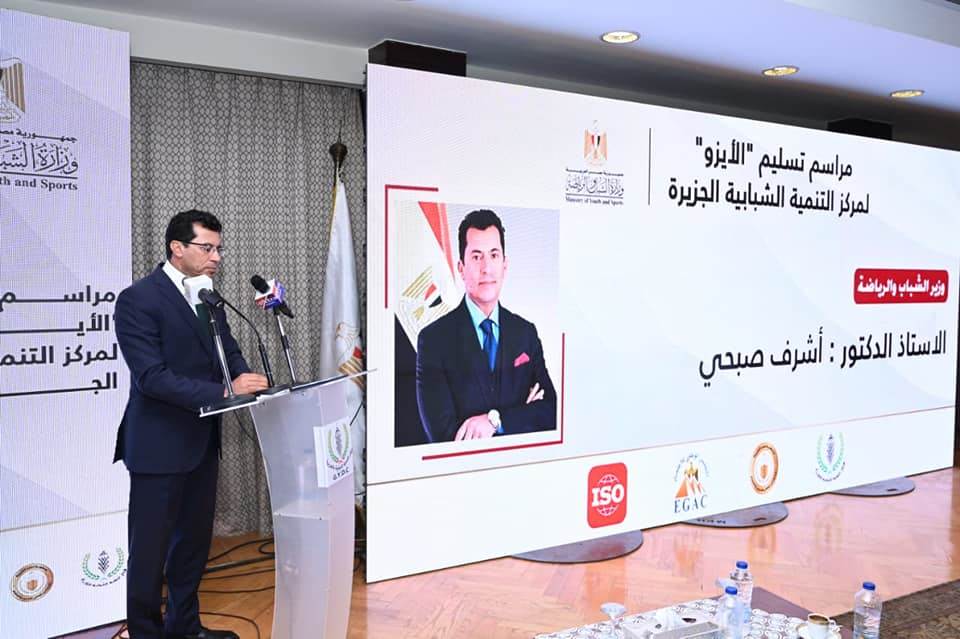 شهد الدكتور أشرف صبحي وزير الشباب والرياضة، والدكتور إبراهيم صابر محافظ القاهرة، حفل تسليم شهادة الأيزو لمركز التنمية الشبابية بالجزيرة، وذلك في إطار جهود الوزارة للارتقاء بمعايير الجودة والإدارة داخل المنشآت الشبابية والرياضية.
