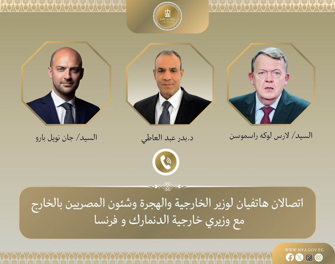 جرى اتصالان هاتفيان بين د. بدر عبد العاطي وزير الخارجية والهجرة وشئون المصريين بالخارج مع كل من “جان نويل بارو” وزير خارجية فرنسا، و“لارس لوكه راسموسن” وزير خارجية الدنمارك وذلك في إطار متابعة التطورات المتسارعة فى قطاع غزة ودعم الامن والاستقرار بالمنطقة.