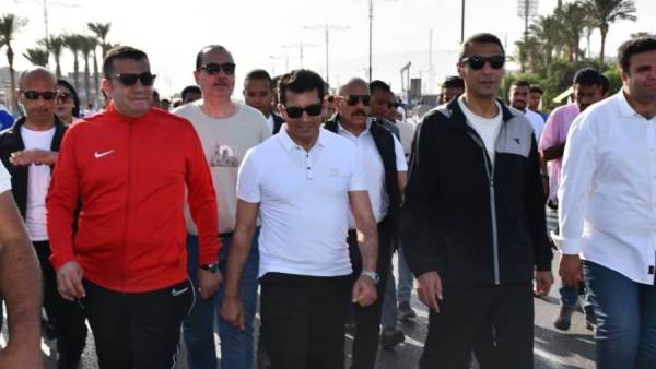 وزير الشباب والرياضة ومحافظ السويس يفتتحان مسيرة مهرجان يوم المشي العالمي