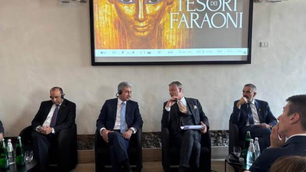وزير السياحة والآثار المصري ووزير الثقافة الإيطالي يعقدان مؤتمرًا صحفيًا حول معرض كنوز الفراعنة