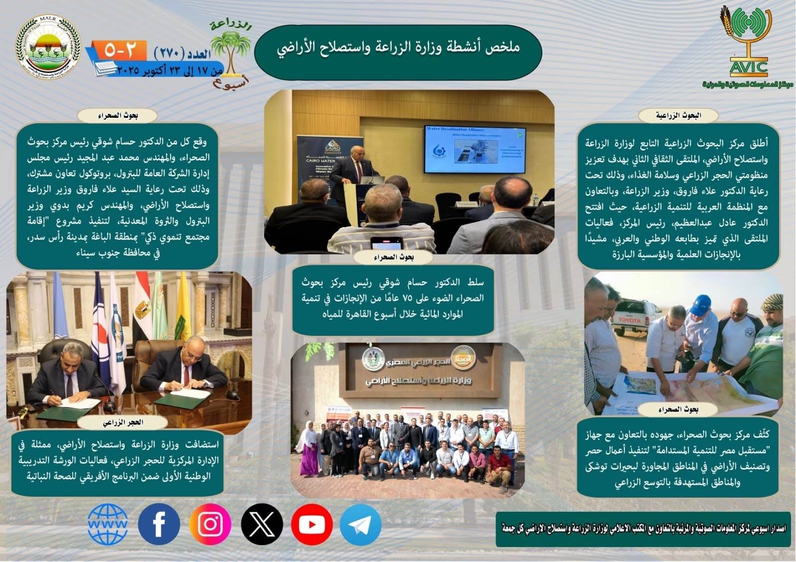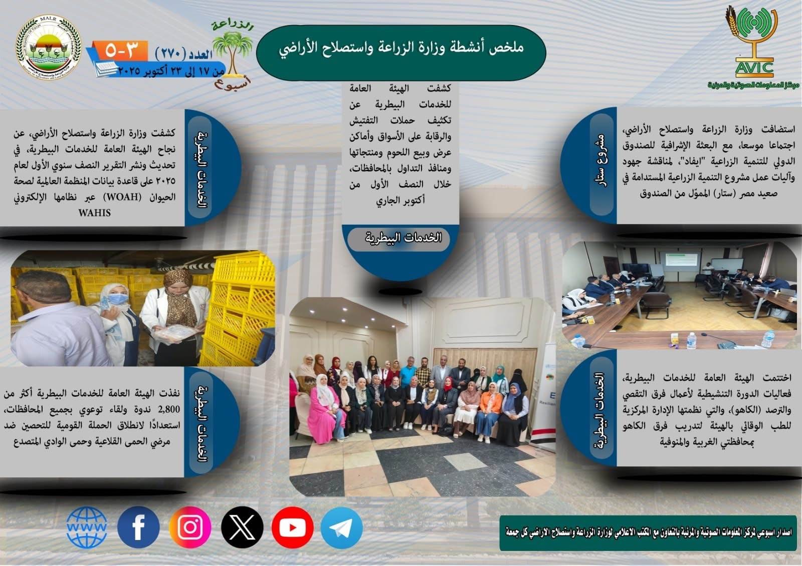 أصدر مركز المعلومات الصوتية والمرئية بوزارة الزراعة واستصلاح الأراضي، "الانفوجراف الاسبوعي" في نسخته رقم 270 حول الحصاد الاسبوعي لأهم أنشطة الوزارة، خلال الاسبوع الماضي في الفترة من 17 وحتى 23 أكتوبر الجاري، كما أصدر المركز ايضا ملخصا بالفيديو، حول انشطة الوزارة خلال نفس الفترة.