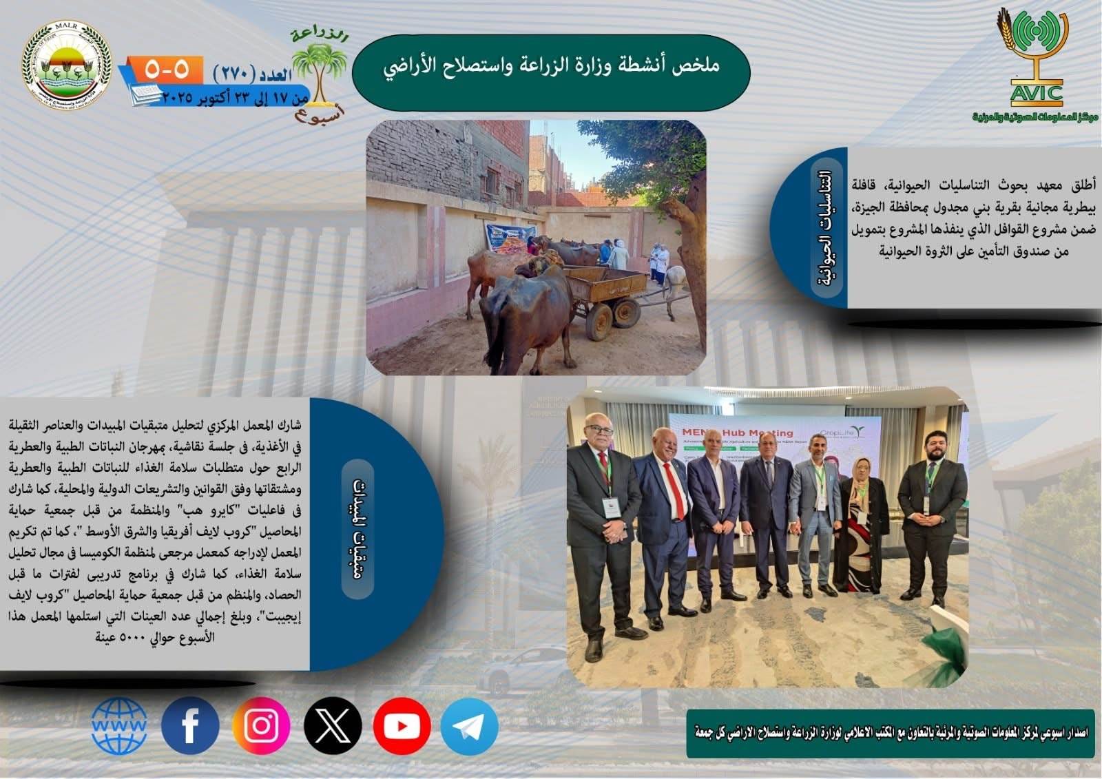 كما كثف مركز الزراعات التعاقدية جهوده، بعقد سلسلة من الورش والندوات التوعوية والزيارات الميدانية المكثفة التي شملت مؤخرا محافظات: الدقهلية، سوهاج، وأسيوط، وذلك في إطار تفعيل منظومة الزراعة التعاقدية للمحاصيل الاستراتيجية، كذلك أطلق معهد بحوث التناسليات الحيوانية، قافلة بيطرية مجانية بقرية بني مجدول بمحافظة الجيزة، ضمن مشروع القوافل الذي ينفذها المشروع بتمويل من صندوق التأمين على الثروة الحيوانية.