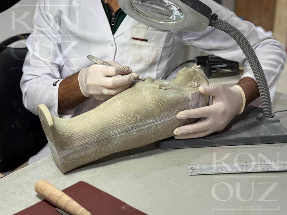 وأوضح اللواء هشام شعراوي رئيس مجلس إدارة شركة كنوز مصر للنماذج الأثرية، أن تصميم الدعوة مر بعدة مراحل دقيقة تعكس حساسية العمل الفني المُستمد من إرث مصر الحضاري، بدأت العملية من قسم النحت، حيث تولّى الفنانون تجسيد الزخارف والرموز والكتابات الهيروغليفية بدقة التماثل الأصلية، ثم انتقلت إلى مراحل الاستنساخ فـالتذهيب فـالتلوين، قبل أن يُغلّف التابوت من الداخل بقماش المخمل الفاخر، لتظهر في صورتها النهائية التي تليق بعظمة الاحتفالية ومكانة المتحف. وبينما يستعد المتحف لاستقبال العالم، تحمل هذه الدعوة رسالة جوهرية بأن حضارة مصر ليست ماضياً يُروى، بل إرثاً نابضاً يستمر في الإلهام عبر الأجيال.