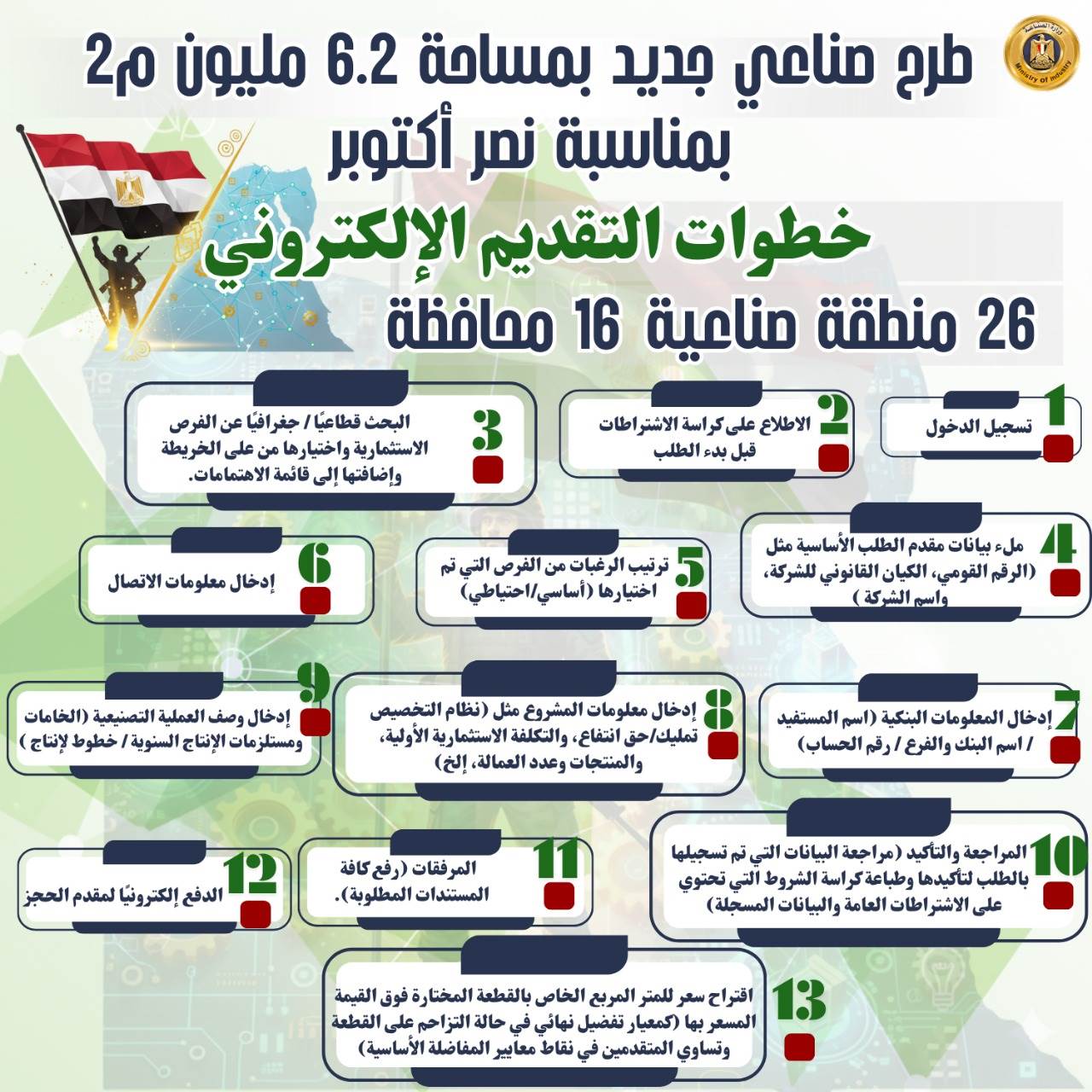 قبل يومين من إغلاق باب التقديم، جددت وزارة الصناعة الدعوة للمستثمرين للتقدم على الطرح الثاني عشر للأراضي الصناعية المرفقة لعدد 1128 قطعة أرض بإجمالي مساحة 6.2 مليون متر مربع موزعة على 26 منطقة ومدينة صناعية في 16 محافظة، حيث تتراوح مساحة الأراضي من 190 متر مربع إلى 500 ألف متر مربع لتناسب مختلف الأنشطة الصناعية، وذلك وفقًا للميزة النسبية لكل محافظة ويستمر التقديم على الطرح حتى يوم 6 نوفمبر 2025، عبر منصة مصر الصناعية الرقمية madein.eg على أن يتم إعلان نتائج التخصيص يوم 24 نوفمبر 2025.