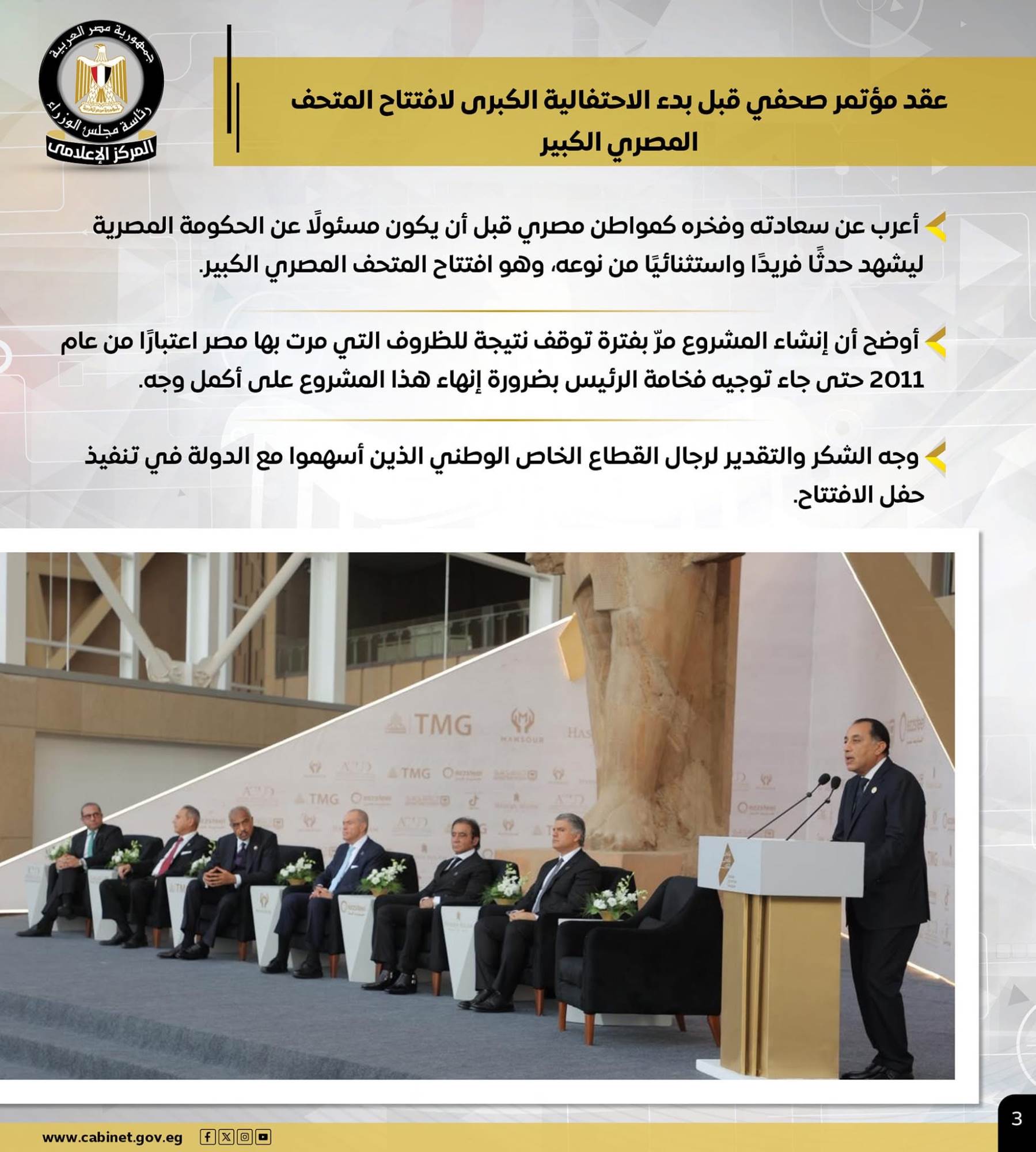 وشملت الأنشطة، عقد رئيس الوزراء مؤتمر صحفي قبل بدء الاحتفالية الكبرى لافتتاح المتحف المصري الكبير، أعرب خلاله عن فخره بهذا الحدث الفريد من نوعه، موضحًا أن المشروع واجه فترة توقف منذ 2011 حتى وجه فخامة الرئيس بضرورة إنهائه على أكمل وجه، وموجهًا الشكر للقطاع الخاص الوطني لمساهمته في تنفيذ حفل الافتتاح.