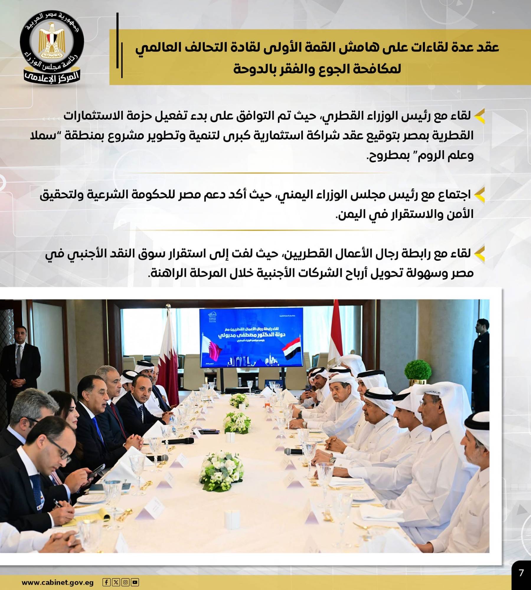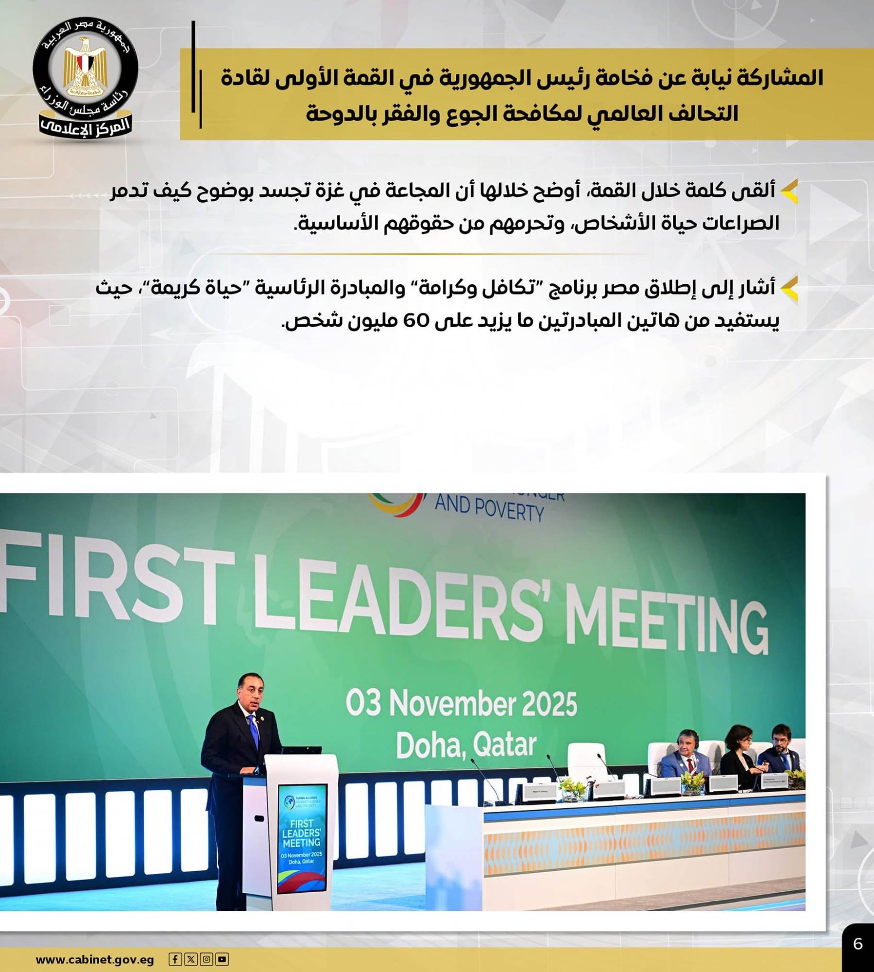 كما شارك نيابة عن الرئيس في "القمة الأولى لقادة التحالف العالمي لمكافحة الجوع والفقر" بالدوحة، وخلال كلمته بالقمة أوضح أن المجاعة في غزة تُجسد بوضوح كيف تدمر الصراعات حياة الأشخاص، مشيرًا إلى استفادة أكثر من 60 مليون شخص من "تكافل وكرامة" و"حياة كريمة".
