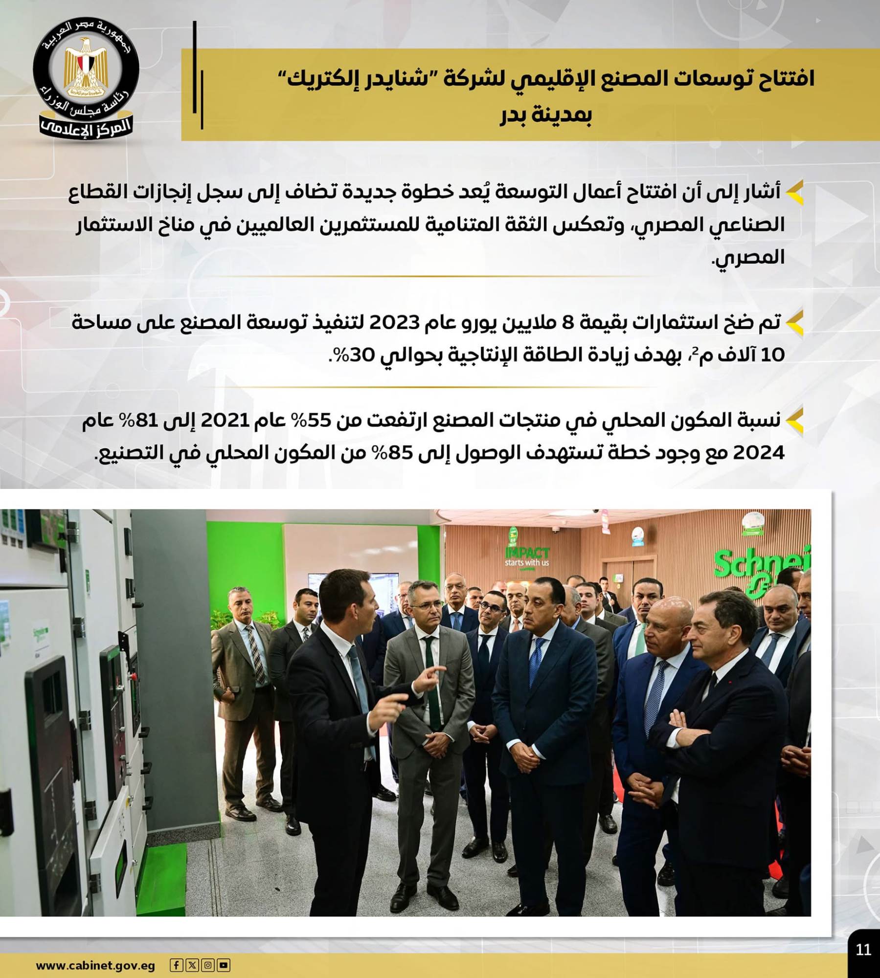 كما افتتح توسعات المصنع الإقليمي لشركة "شنايدر إلكتريك" بمدينة بدر، موضحًا أن هذه الخطوة تعكس ثقة المستثمرين العالميين المتنامية في مناخ الاستثمار المصري، وتمت الإشارة إلى أنه تم ضخ استثمارات بقيمة 8 ملايين يورو عام 2023 لتنفيذ توسعة المصنع على مساحة 10 آلاف م2 لزيادة الطاقة الإنتاجية بنسبة 30%، كما ارتفعت نسبة المكون المحلي في منتجات المصنع إلى 81% عام 2024 مع خطة للوصول إلى 85%.