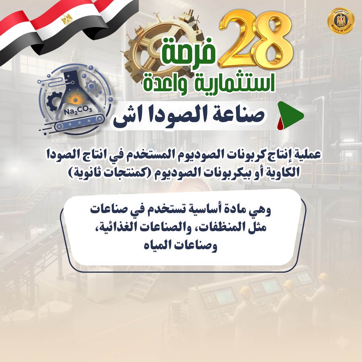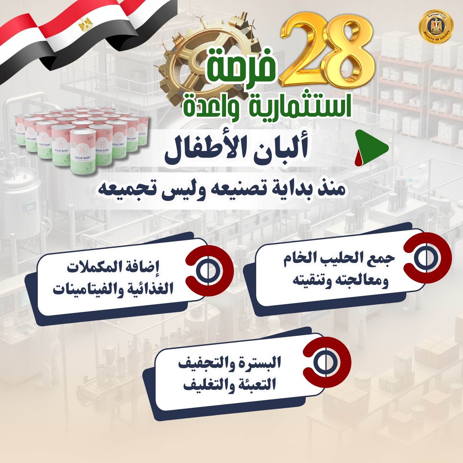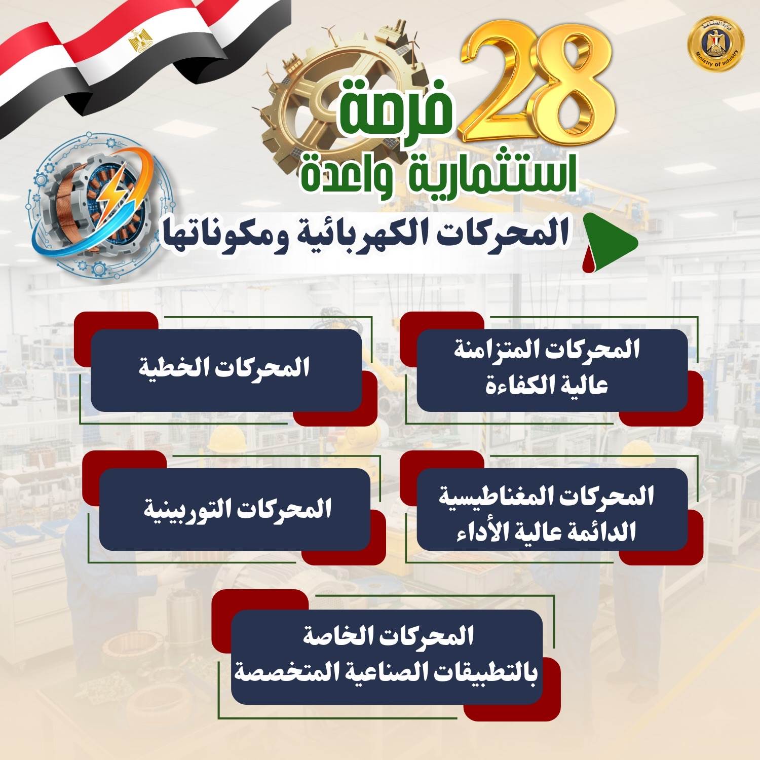 وفيما يلي الفرص الاستثمارية الـ28 بالتفصيل: 1- مكونات الطاقة الشمسية التي تشمل (الخلايا- بطاريات التخزين- أنظمة التتبع الشمسي- العاكسات- برمجيات المراقبة الذكية- الألواح الشمسية الشفافة التقليدية- الألواح القابلة للطباعة المبتكرة- تقنيات تخزين الطاقة المتقدمة) 2- السيارات ومكوناتها (السيارات الكهربائية- إطارات السيارات- المعدات المختلفة مثل المحركات- أنظمة التوجيه- أنظمة التعليق- المكابح- الزجاج- هياكل السيارات والأتوبيسات- الطنابير- بطاريات السيارات الكهربائية وسيارات البنزين- الإضاءة- الإلكترونيات والأنظمة الذكية) 3- صناعة البرمجيات وأدوات التحكم في المنظومة الصناعية (حلول الذكاء الاصطناعي والتعلم الآلي للقطاعات الصناعية- الحلول الذكية للرعاية الصحية- أنظمة القيادة الذاتية في السيارات- البرمجيات الذكية لأجهزة الإلكترونيات- حلول الذكاء الاصطناعي في التجارة الإلكترونية). 4- مكونات طاقة الرياح (المواتير- المراوح- العاكسات- الأبراج الداعمة- المحولات- أنظمة التحكم- البطاريات أو أنظمة التخزين- أجهزة المراقبة والصيانة) 5- مكونات محطات التحلية والمعالجة (أغشية التناضح العكسي - طلمبات الضغط- أنظمة الفلاتر- خزانات المياه- أنظمة الكهرباء والتحكم- أنظمة التطهير الكيميائي- مولدات الطاقة- أجهزة المراقبة والصيانة- أنظمة التحكم في جودة المياه المعالجة- أجهزة الترشيح- المصافي). 6- ألبان الأطفال منذ بداية تصنيعه وليس تجميعه (جمع الحليب الخام- معالجته وتنقيته - البسترة - إضافة المكملات الغذائية والفيتامينات - التجفيف -التعبئة والتغليف) 7- ألومنيوم (قطاعات الألومنيوم - ورق الفويل - الألواح - الكلادينج -أسلاك الألومنيوم- قطع الغيار الصناعية - الحاويات والأوعية- الألومنيوم المعالج بالحرارة - الألومنيوم المؤكسد) 8- المحولات الكهربائية (العوازل الكهربائية المتقدمة - أنظمة التبريد المتقدمة -المفاتيح الكهربائية الذكية وأنظمة التحكم المتطورة - المحولات الجافة - تقنيات القياس المتقدمة- محولات الجهد العالي جدًا) 9- المواسير غير الملحومة (المواسير- المواسير المضلعة- المواسير المقاومة للتآكل- المواسير المعزولة حراريًا) 10- مضخات رفع المياه ومواتير الأجهزة: (مضخات أفقية - مضخات غاطسة) (مواتير غسالات الصحون / الملابس- مواتير المكيفات الثابتة / المحمولة -مواتير الخلاطات المتخصصة عالية الأداء)، ومواتير الخلاطات المتخصصة عالية الأداء) 11- المستحضرات الطبية وأدوات التجميل: تعتمد على زراعة النباتات العطرية والطبية واستخراج الزيوت العطرية والمستخلصات الطبيعية وتُستخدم في تصنيع المستحضرات الدوائية والتجميلية 12- صناعة البوليستر (الألياف البوليستر عالية الأداء- البوليستر المعالج بالحرارة- البوليستر المقاوم للحرائق- البوليستر المقوى بالألياف الزجاجية- البوليستر المُعاد تدويره بكفاءة عالية). 13- صناعة الصودا أش: صناعة الصودا: هي عملية إنتاج كربونات الصوديوم المستخدم في انتاج الصودا الكاوية أو بيكربونات الصوديوم (كمنتجات ثانوية)، وهي مادة أساسية تستخدم في صناعات مثل المنظفات، والصناعات الغذائية، وصناعات المياه. 14- المحركات الكهربائية ومكوناتها (المحركات المتزامنة عالية الكفاءة- المحركات الخطية- المحركات المغناطيسية الدائمة عالية الأداء- المحركات التوربينية- المحركات الخاصة بالتطبيقات الصناعية المتخصصة) 15- المولدات الكهربائية (المولدات الغازية عالية الكفاءة- المولدات التوربينية الكبيرة- المولدات المحمولة للطوارئ عالية القدرة- المولدات الهجينة العاملة بالوقود المتعدد- المولدات العاملة بالطاقة الشمسية) 16- الأحبار: الطباعة على الورق- البلاستيك 17- الأدوات الكهربائية (المفاتيح الذكية "Smart Switches"- قواعد الإنارة المتطورة مثل قواعد الإنارة ذات التحكم عن بعد- البرايز المقاومة للحرارة العالية- الترانسات الخاصة بالتطبيقات الصناعية- الفيوزات الذكية- سويتشات للتحكم في الإضاءة عبر الواي فاي- مفاتي