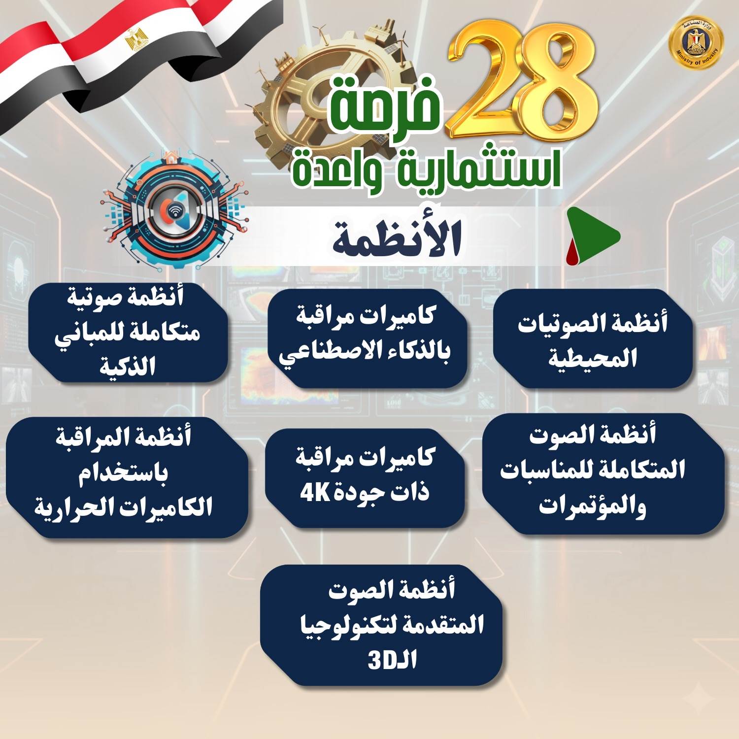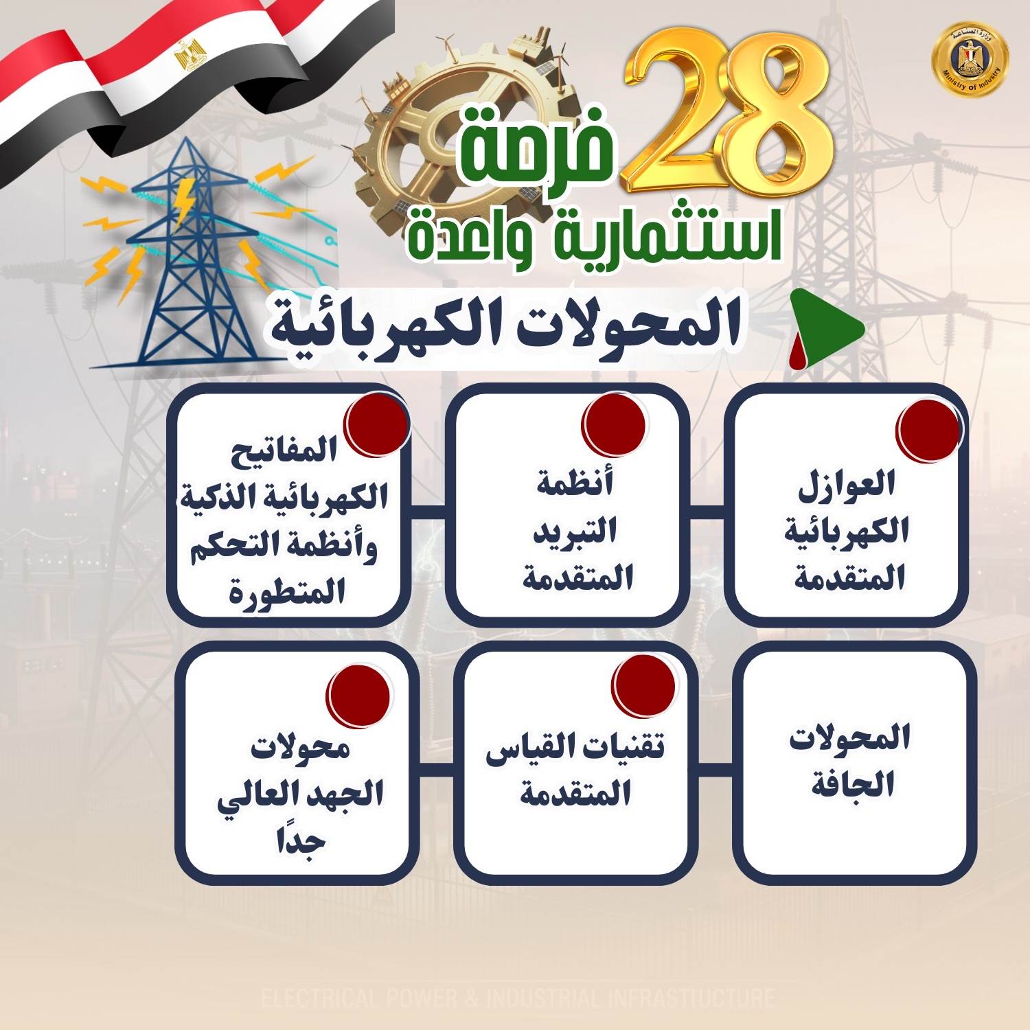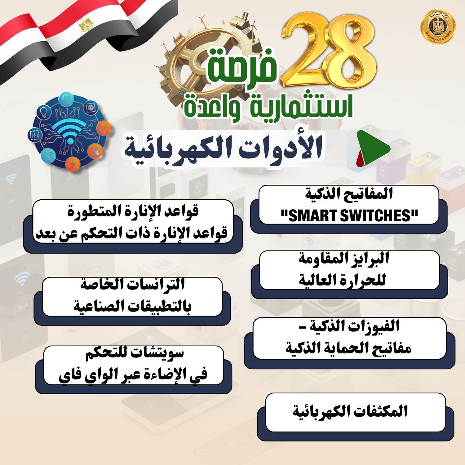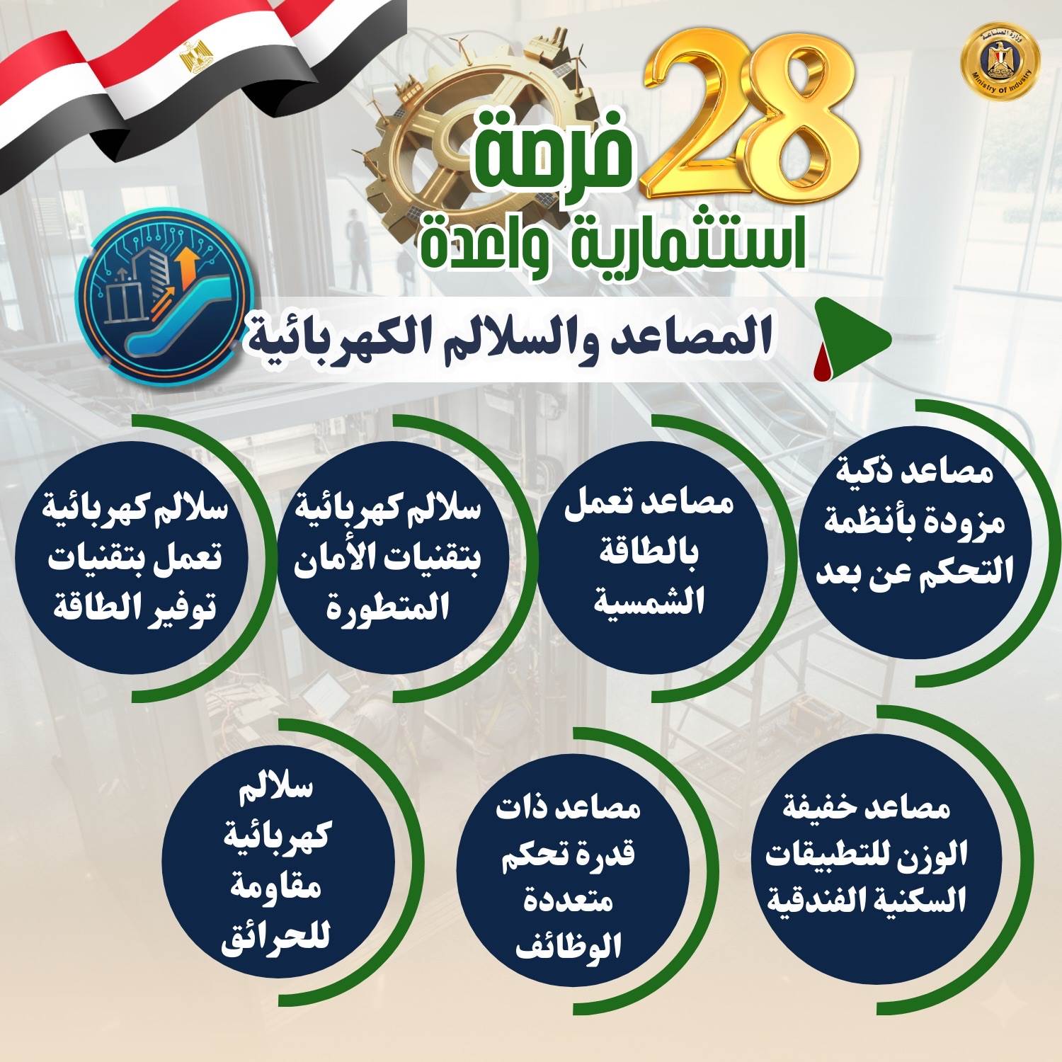 وفيما يلي الفرص الاستثمارية الـ28 بالتفصيل: 1- مكونات الطاقة الشمسية التي تشمل (الخلايا- بطاريات التخزين- أنظمة التتبع الشمسي- العاكسات- برمجيات المراقبة الذكية- الألواح الشمسية الشفافة التقليدية- الألواح القابلة للطباعة المبتكرة- تقنيات تخزين الطاقة المتقدمة) 2- السيارات ومكوناتها (السيارات الكهربائية- إطارات السيارات- المعدات المختلفة مثل المحركات- أنظمة التوجيه- أنظمة التعليق- المكابح- الزجاج- هياكل السيارات والأتوبيسات- الطنابير- بطاريات السيارات الكهربائية وسيارات البنزين- الإضاءة- الإلكترونيات والأنظمة الذكية) 3- صناعة البرمجيات وأدوات التحكم في المنظومة الصناعية (حلول الذكاء الاصطناعي والتعلم الآلي للقطاعات الصناعية- الحلول الذكية للرعاية الصحية- أنظمة القيادة الذاتية في السيارات- البرمجيات الذكية لأجهزة الإلكترونيات- حلول الذكاء الاصطناعي في التجارة الإلكترونية). 4- مكونات طاقة الرياح (المواتير- المراوح- العاكسات- الأبراج الداعمة- المحولات- أنظمة التحكم- البطاريات أو أنظمة التخزين- أجهزة المراقبة والصيانة) 5- مكونات محطات التحلية والمعالجة (أغشية التناضح العكسي - طلمبات الضغط- أنظمة الفلاتر- خزانات المياه- أنظمة الكهرباء والتحكم- أنظمة التطهير الكيميائي- مولدات الطاقة- أجهزة المراقبة والصيانة- أنظمة التحكم في جودة المياه المعالجة- أجهزة الترشيح- المصافي). 6- ألبان الأطفال منذ بداية تصنيعه وليس تجميعه (جمع الحليب الخام- معالجته وتنقيته - البسترة - إضافة المكملات الغذائية والفيتامينات - التجفيف -التعبئة والتغليف) 7- ألومنيوم (قطاعات الألومنيوم - ورق الفويل - الألواح - الكلادينج -أسلاك الألومنيوم- قطع الغيار الصناعية - الحاويات والأوعية- الألومنيوم المعالج بالحرارة - الألومنيوم المؤكسد) 8- المحولات الكهربائية (العوازل الكهربائية المتقدمة - أنظمة التبريد المتقدمة -المفاتيح الكهربائية الذكية وأنظمة التحكم المتطورة - المحولات الجافة - تقنيات القياس المتقدمة- محولات الجهد العالي جدًا) 9- المواسير غير الملحومة (المواسير- المواسير المضلعة- المواسير المقاومة للتآكل- المواسير المعزولة حراريًا) 10- مضخات رفع المياه ومواتير الأجهزة: (مضخات أفقية - مضخات غاطسة) (مواتير غسالات الصحون / الملابس- مواتير المكيفات الثابتة / المحمولة -مواتير الخلاطات المتخصصة عالية الأداء)، ومواتير الخلاطات المتخصصة عالية الأداء) 11- المستحضرات الطبية وأدوات التجميل: تعتمد على زراعة النباتات العطرية والطبية واستخراج الزيوت العطرية والمستخلصات الطبيعية وتُستخدم في تصنيع المستحضرات الدوائية والتجميلية 12- صناعة البوليستر (الألياف البوليستر عالية الأداء- البوليستر المعالج بالحرارة- البوليستر المقاوم للحرائق- البوليستر المقوى بالألياف الزجاجية- البوليستر المُعاد تدويره بكفاءة عالية). 13- صناعة الصودا أش: صناعة الصودا: هي عملية إنتاج كربونات الصوديوم المستخدم في انتاج الصودا الكاوية أو بيكربونات الصوديوم (كمنتجات ثانوية)، وهي مادة أساسية تستخدم في صناعات مثل المنظفات، والصناعات الغذائية، وصناعات المياه. 14- المحركات الكهربائية ومكوناتها (المحركات المتزامنة عالية الكفاءة- المحركات الخطية- المحركات المغناطيسية الدائمة عالية الأداء- المحركات التوربينية- المحركات الخاصة بالتطبيقات الصناعية المتخصصة) 15- المولدات الكهربائية (المولدات الغازية عالية الكفاءة- المولدات التوربينية الكبيرة- المولدات المحمولة للطوارئ عالية القدرة- المولدات الهجينة العاملة بالوقود المتعدد- المولدات العاملة بالطاقة الشمسية) 16- الأحبار: الطباعة على الورق- البلاستيك 17- الأدوات الكهربائية (المفاتيح الذكية "Smart Switches"- قواعد الإنارة المتطورة مثل قواعد الإنارة ذات التحكم عن بعد- البرايز المقاومة للحرارة العالية- الترانسات الخاصة بالتطبيقات الصناعية- الفيوزات الذكية- سويتشات للتحكم في الإضاءة عبر الواي فاي- مفاتي