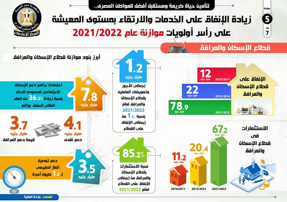 ورصد التقرير أبرز بنود موازنة قطاع الإسكان والمرافق، موضحاً أنه تم اعتماد 7.8 مليار جنيه لبرنامج دعم الإسكان الاجتماعي لمحدودي الدخل بنسبة زيادة 36.2% عن العام المالي السابق، وبواقع 4.1 مليار جنيه دعم نقدي، و3.7 مليار جنيه قيمة دعم المرافق، كما تم تخصيص 3.5 مليار جنيه لدعم توصيل الغاز الطبيعي لـ 1.2 مليون أسرة.