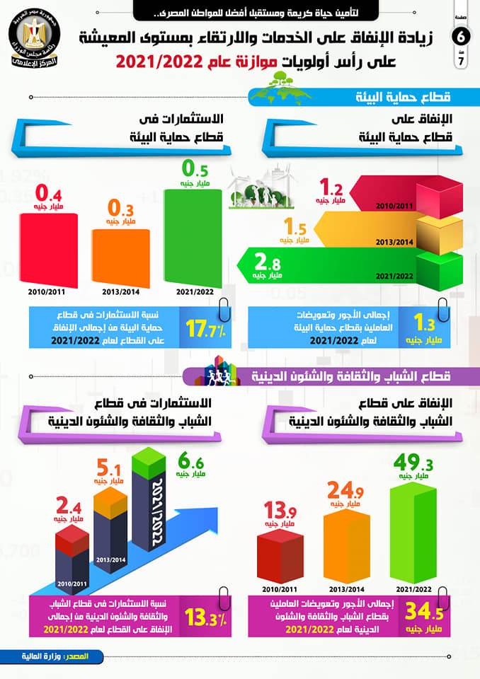 أما عن قطاع الشباب والثقافة والشئون الدينية، أبرز التقرير أن حجم الإنفاق على القطاع بلغ 49.3 مليار جنيه في موازنة 2021/ 2022، مقارنة بـ 24.9 مليار جنيه لعام 2013/ 2014، و13.9مليار جنيه لعام 2010/ 2011.