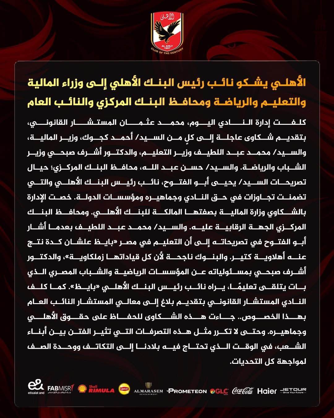 كلفت إدارة النادي الأهلي اليوم، محمد عثمان المستشار القانوني، بتقديم شكاوى عاجلة إلى كلٍ من أحمد كجوك، وزير المالية، ومحمد عبد اللطيف وزير التعليم، والدكتور أشرف صبحي وزير الشباب والرياضة، وحسن عبد الله، محافظ البنك المركزي، حيال تصريحات يحيى أبو الفتوح، نائب رئيس البنك الأهلي، التي تضمنت تجاوزات في حق النادي وجماهيره ومؤسسات الدولة.