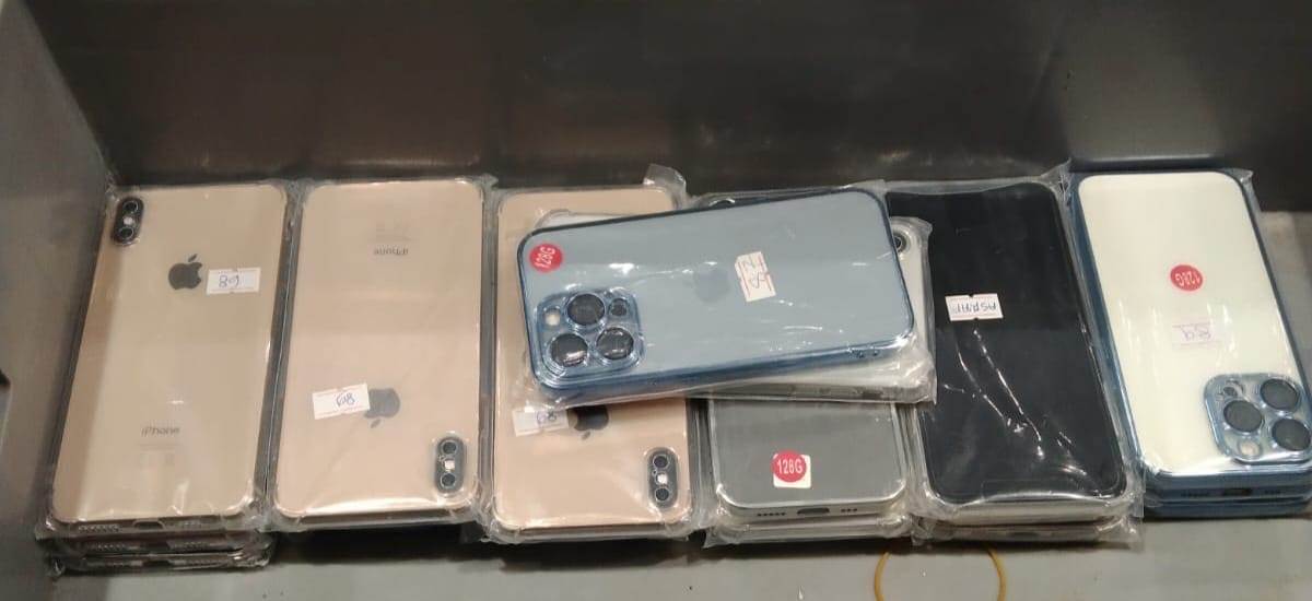 وبتفتيش حقائب الراكب تم العثور على ٤ هواتف محمولة ماركة iphone xs max بدون علب أو لوازم.